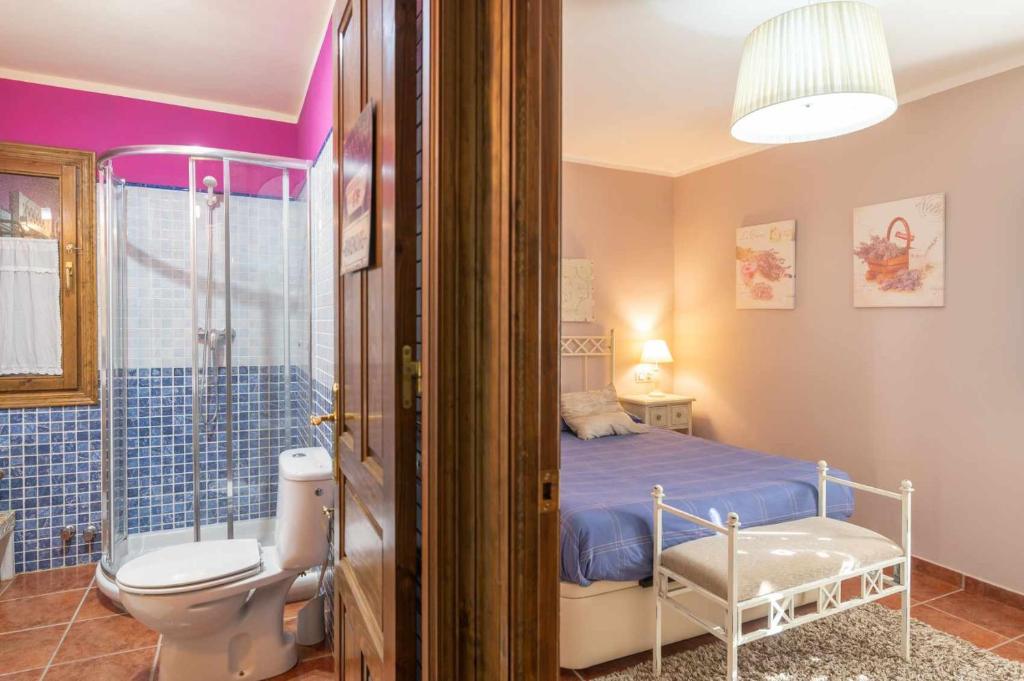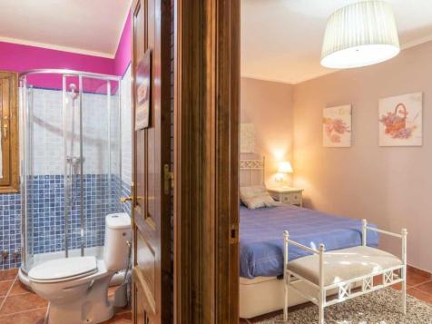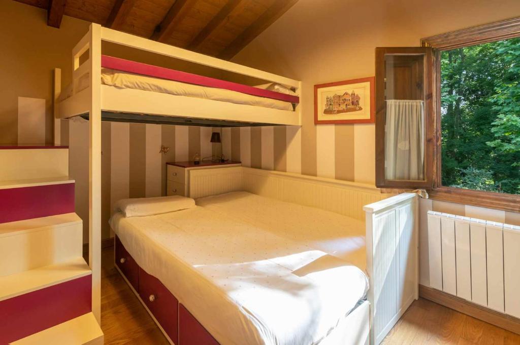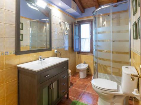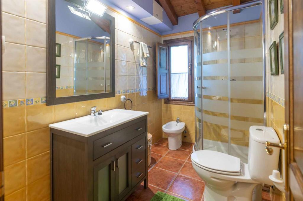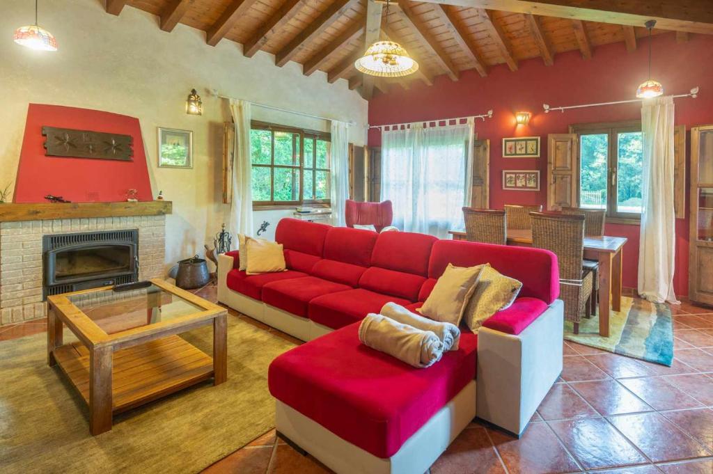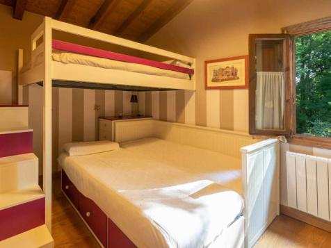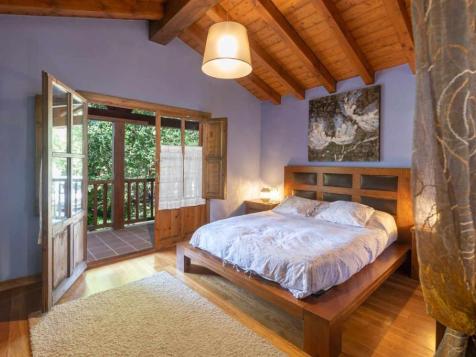 La vivienda esta distribuida en 2 plantas, en la inferior hay una habitación con cama de matrimonio, un baño completo con ducha y cocina. Además de un espectacular salón con techos altos y chimenea. Tanto la cocina como el salón tienen salida al porche. En la parte superior hay una habitación abierta (con cortinas a modo de separación) con cama de matrimonio y salida a balcón, un baño completo con ducha y una habitación con litera.