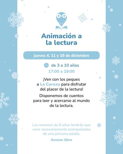 - Jueves 4, 11 y 18 · 17:00–19:00 — Animación a la lectura (3–10 años). Acceso libre. Menores de 8 años, acompañados de una persona adulta.
