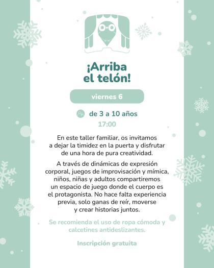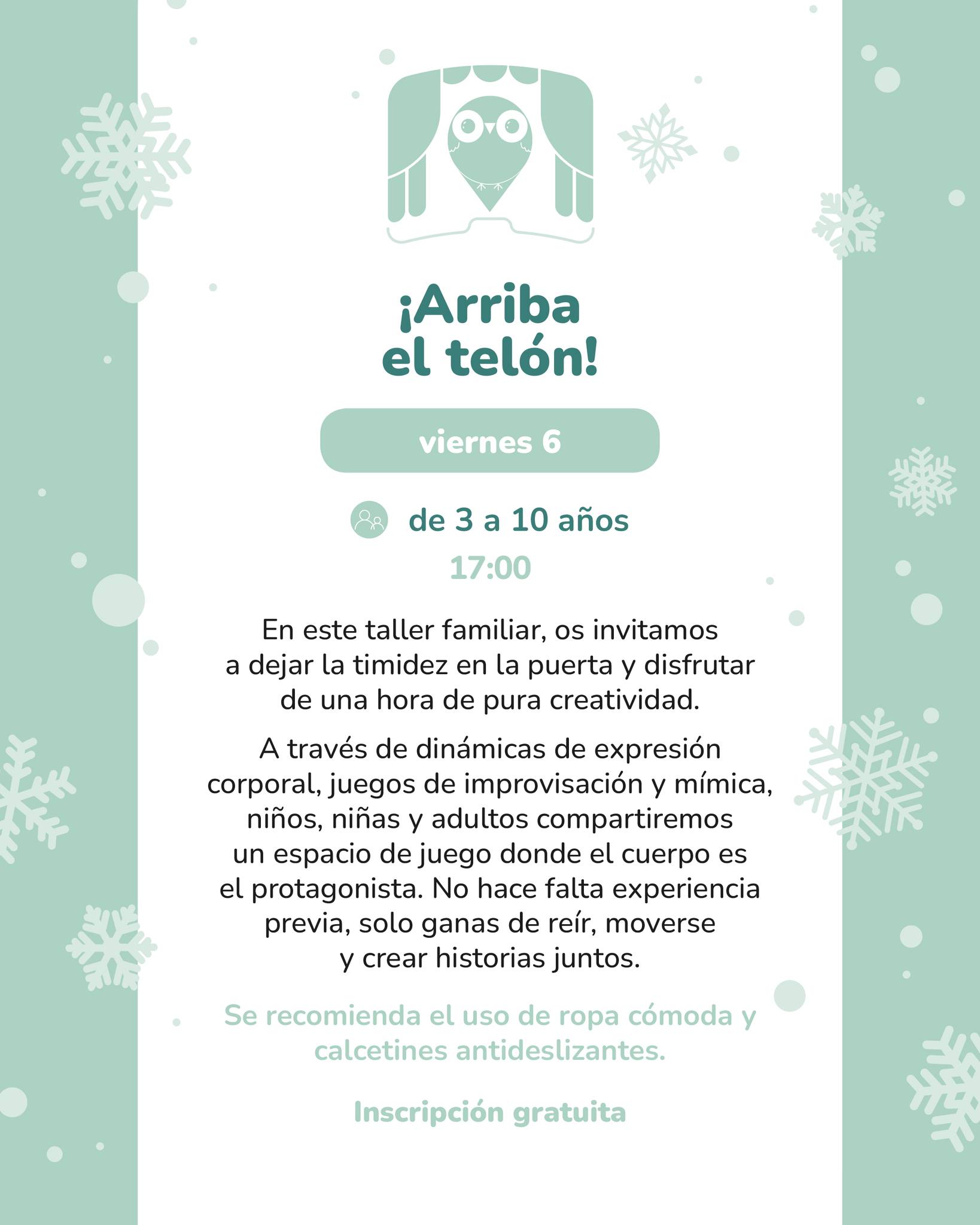 Vie 6 · 17:00 — ¡Arriba el telón! (3–10 años). Taller familiar de expresión corporal y creación de historias. Inscripción gratuita por teléfono.