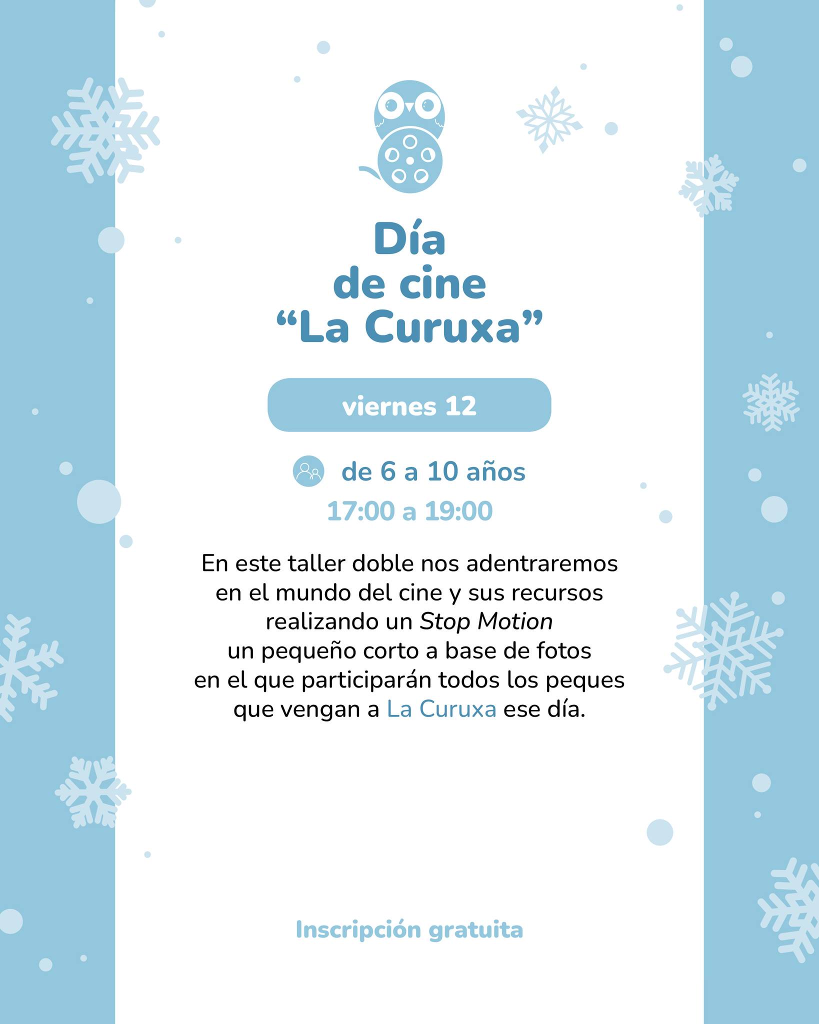 - Viernes 12 · 17:00–19:00 — Día de cine “La Curuxa” (6–10 años). Inscripción gratuita por teléfono.