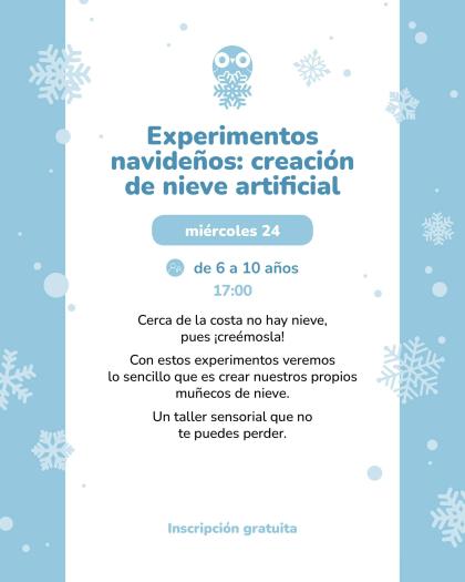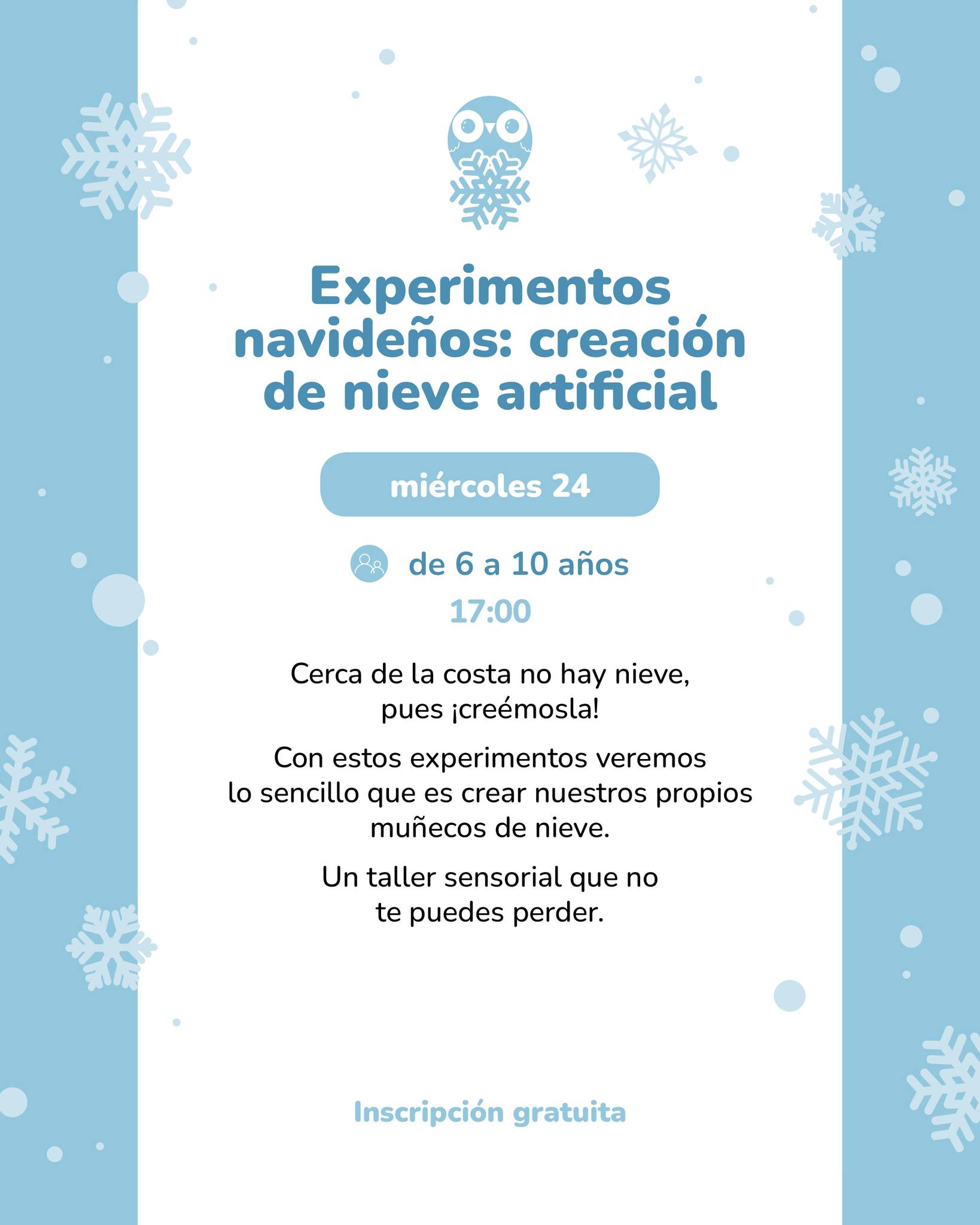 - Miércoles 24 · 17:00 — Experimentos navideños: creación de nieve artificial (6–10 años). Inscripción gratuita por teléfono.