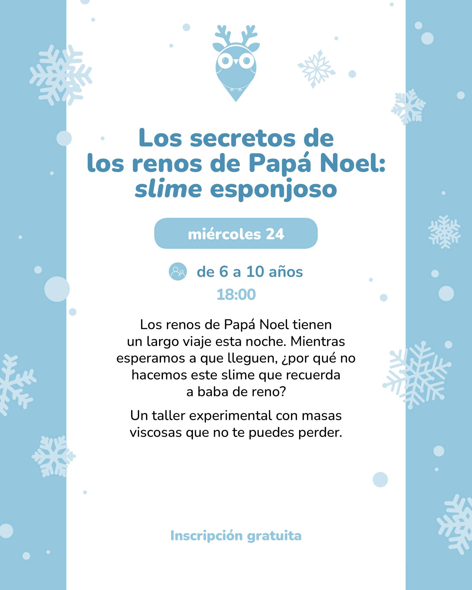 - Miércoles 24 · 18:00 — Los secretos de los renos de Papá Noel: slime esponjoso (6–10 años). Inscripción gratuita por teléfono.