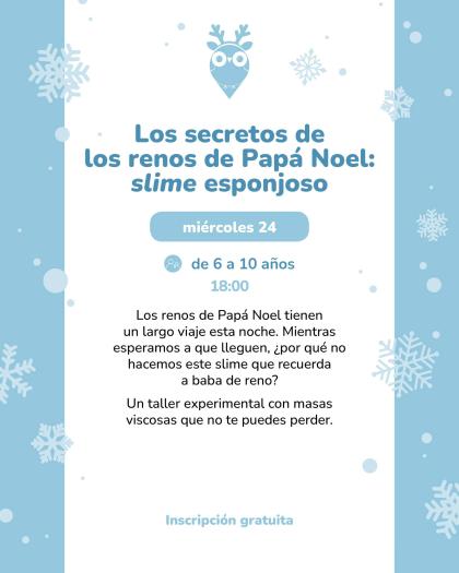- Miércoles 24 · 18:00 — Los secretos de los renos de Papá Noel: slime esponjoso (6–10 años). Inscripción gratuita por teléfono.