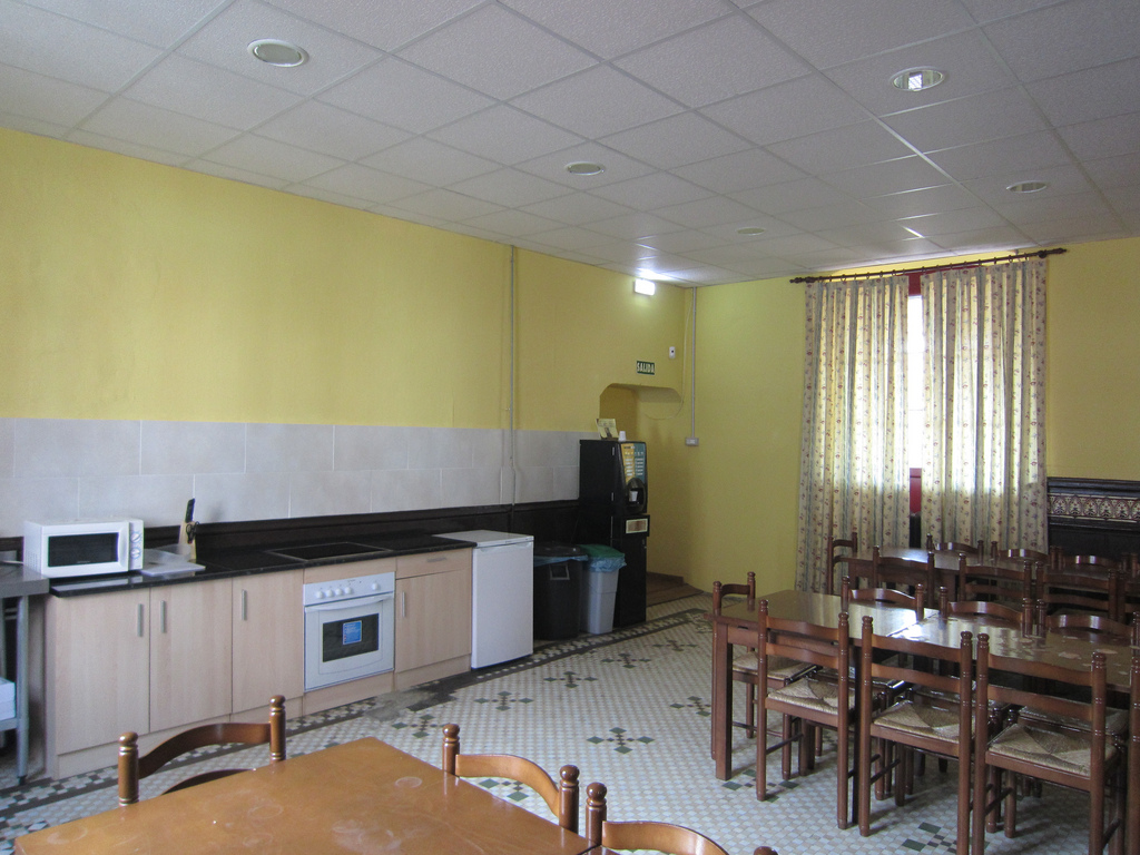 SALÓN-COMEDOR. Tenemos un salón comedor con TV y DVD de usos múltiples. Tenemos cocina vitrocerámica, horno, microondas, tostador y nevera a disposición de los Alberguistas. En el Albergue solo servimos desayunos, las comidas y cenas se ofrecen en un restaurante cercano al Albergue.