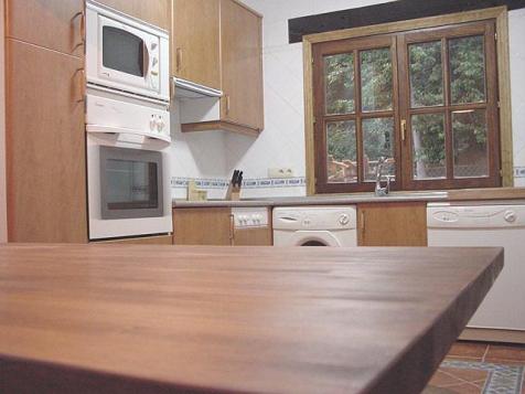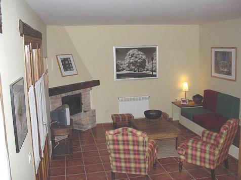 Casa rural de dos plantas de reciente construcción, con jardín alrededor.