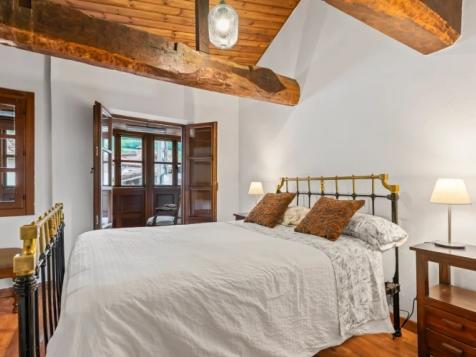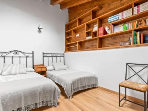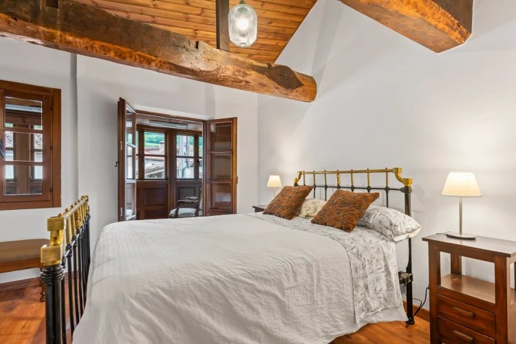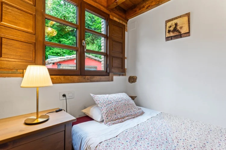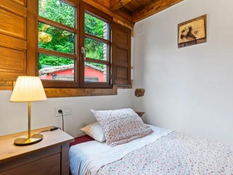 Planta superior: dos dormitorios dobles; uno con cama de matrimonio y otro con dos camas de 105cm. El dormitorio principal cuenta con vestidor y una galería cubierta con mirador, ideal para disfrutar de las vistas panorámicas a las montañas que ofrece el alojamiento.