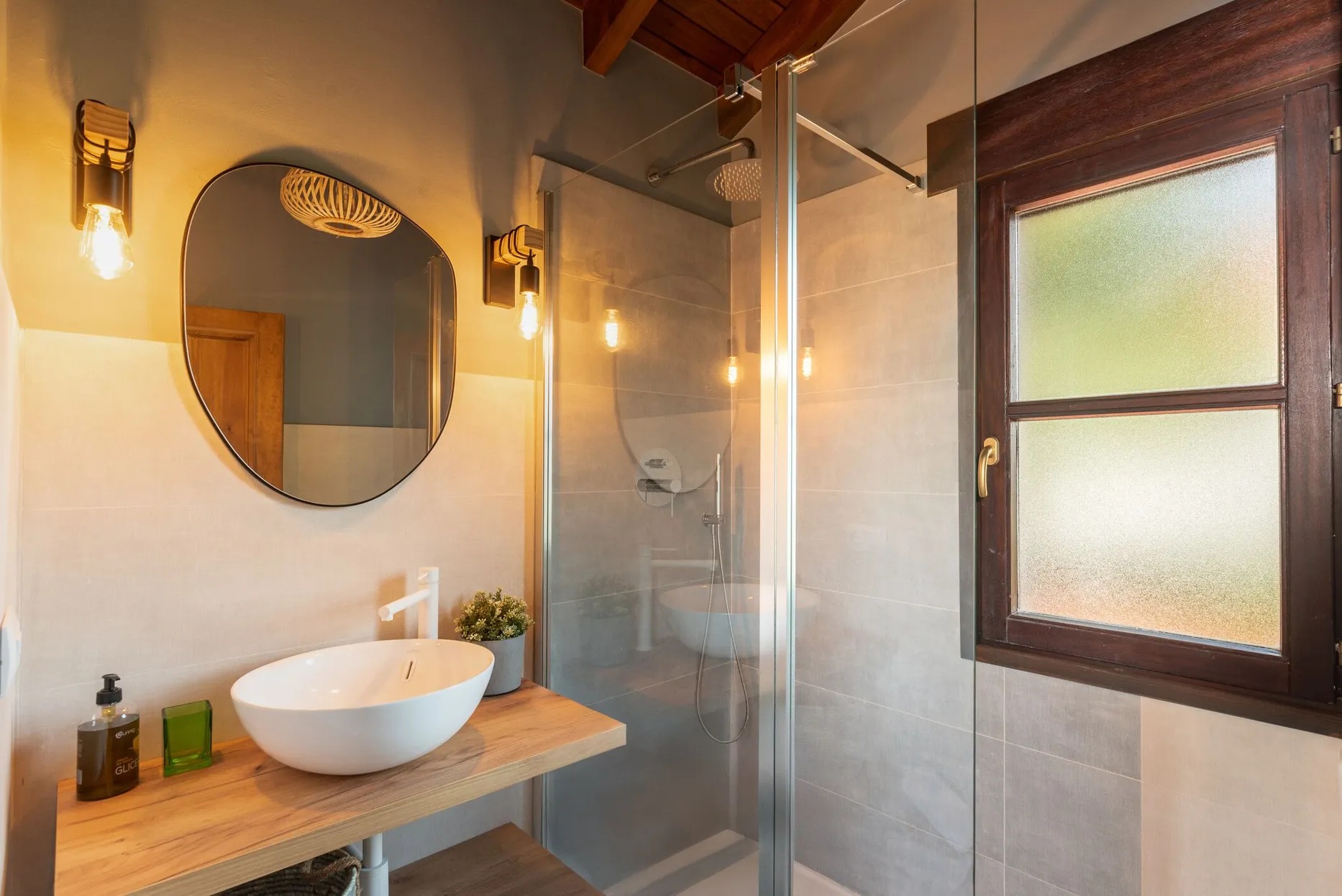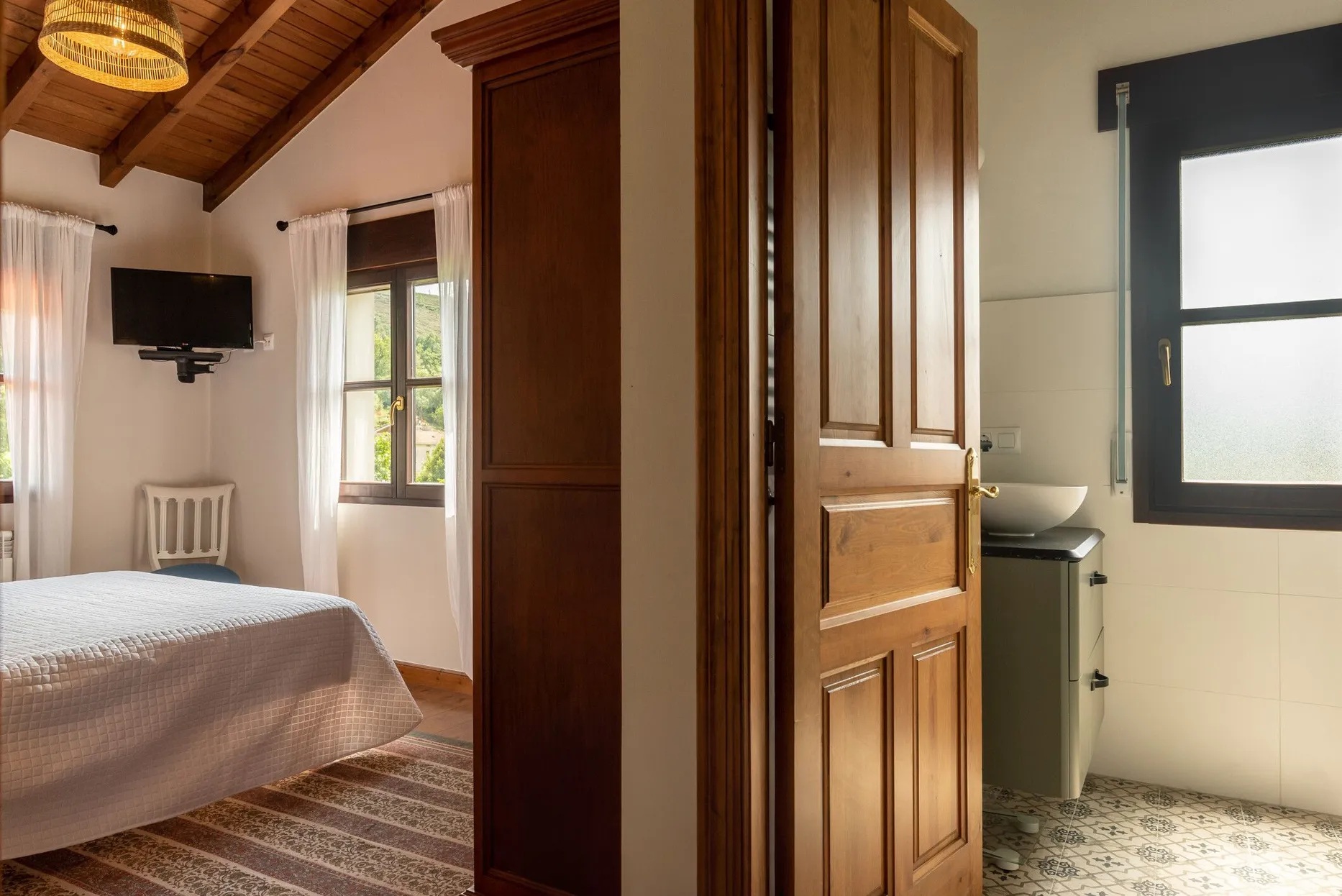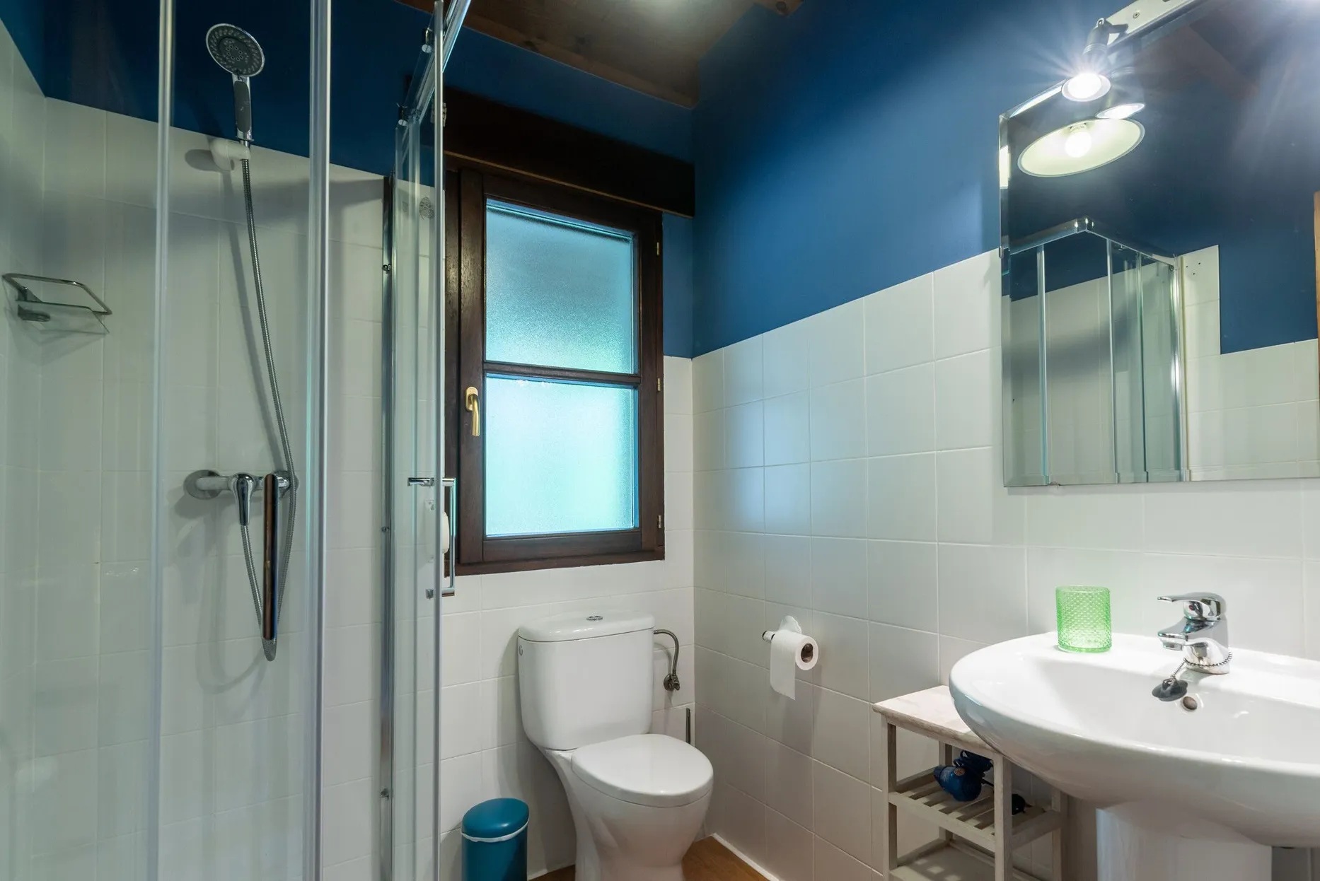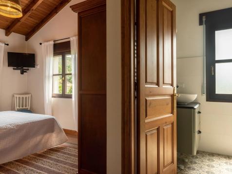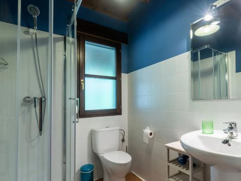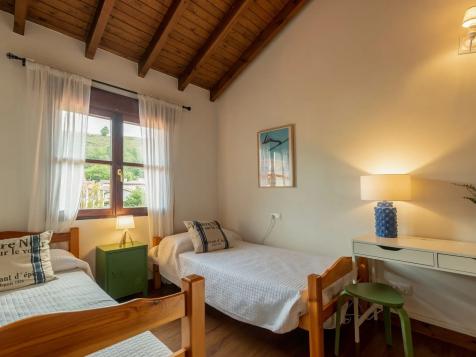 En la primera planta: dos dormitorios con dos camas de 0,90 m., un baño completo, un dormitorio con una cama doble de 1,60 m y su propio baño privado.