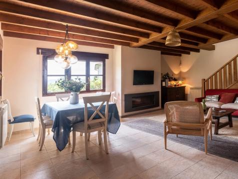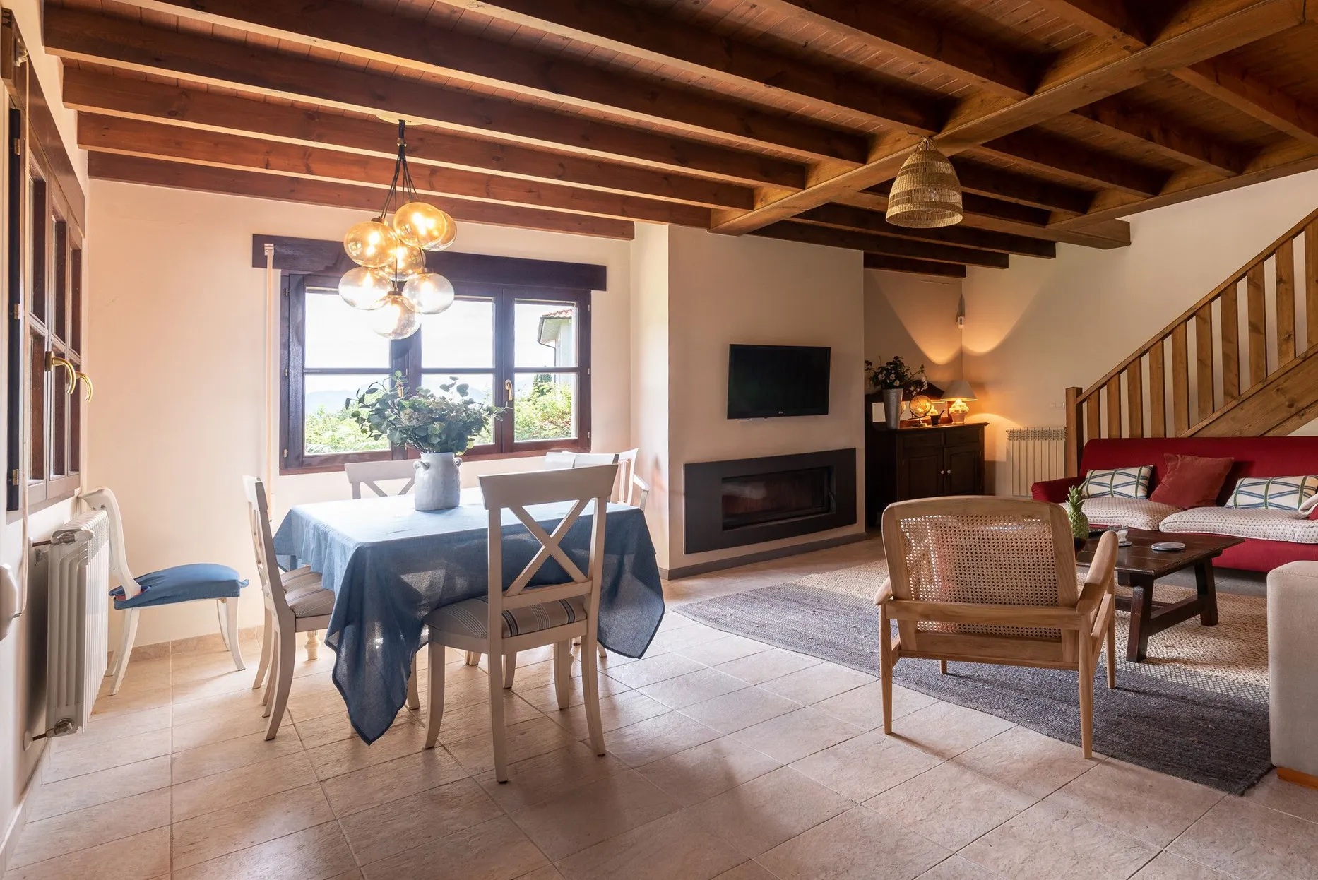 En la planta baja: salón comedor con chimenea abierto a la cocina, un cuarto de baño y un dormitorio para 2 personas con una cama de 1.60cm.