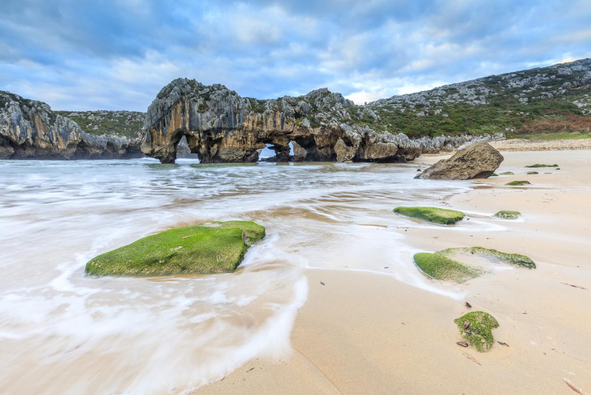 Es una maravilla de piedra tallada por el mar, arenas finísimas y aguas muy transparentes a 1,5 km de Villanueva y a 2 de Nueva, población donde se pueden encontrar numerosos ejemplos de arquitectura indiana.