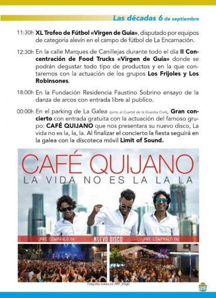 00:00 h. En el parking de La Galea (junto al Cuartel de la Guardia Civil), Gran Concierto con entrada gratuita con la actuación del famoso grupo: CAFÉ QUIJANO que nos presentará su nuevo disco "La vida no es la, la, la". Al finalizar el concierto seguirá en La Galea con la discoteca móvil LIMIT OF SOUND.
