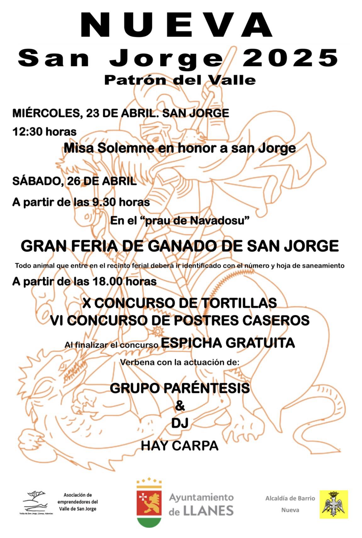 A partir de las 9:30 horas, en el "prau de Navadosu" GRAN FERIA DE GANADO SAN JORGE (todo animal que entre en el recinto ferial deberá ir identificado con el número y hoja de saneamiento).