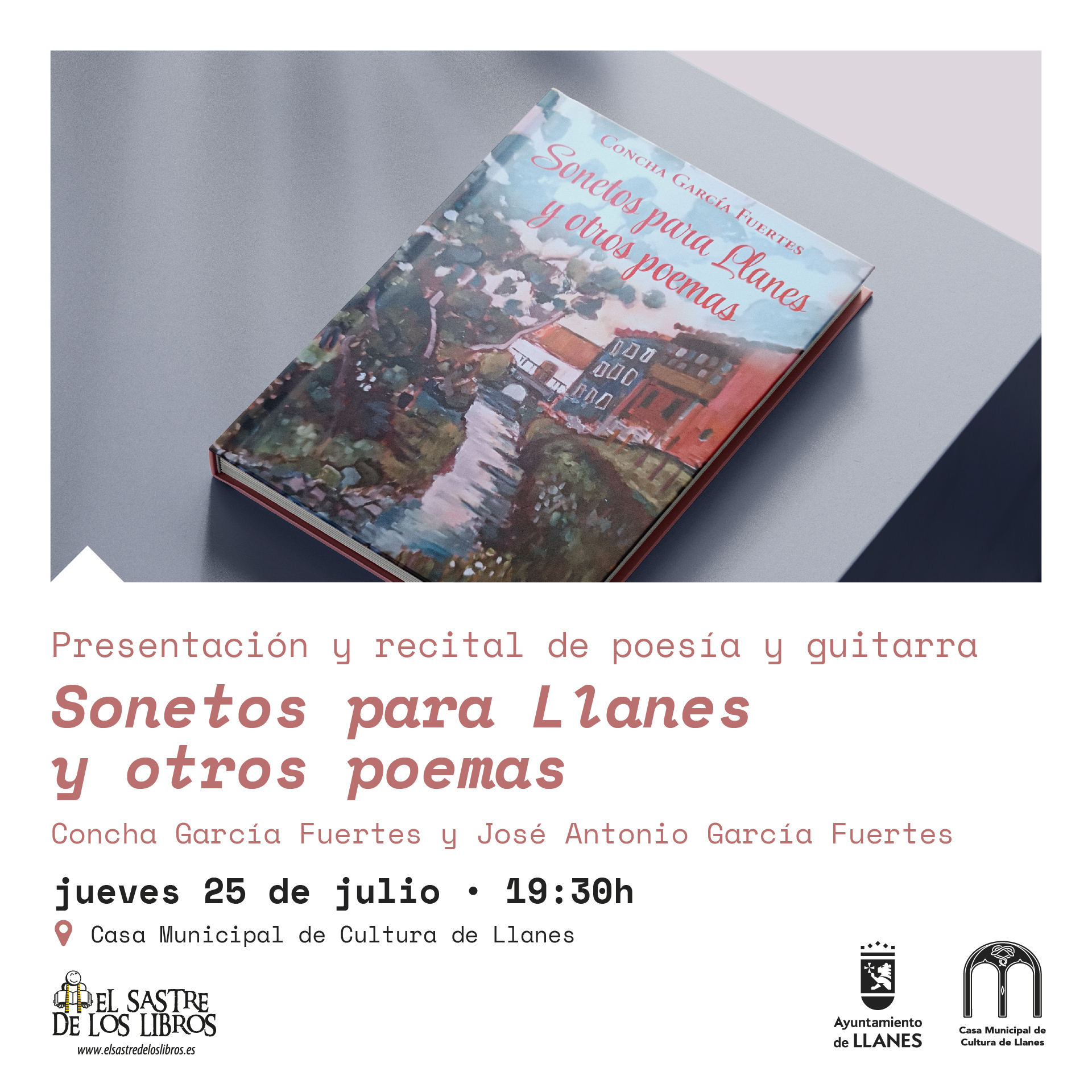 El jueves 25, a las 19:30 h. en la Casa Municipal de Cultura, se presenta “Sonetos para Llanes y otros poemas” de Concha García Fuertes y editado por “El sastre de los libros". La autora nos presentará su libro y recitará varios sonetos acompañada por la guitarra de Jose Antonio García Fuertes.