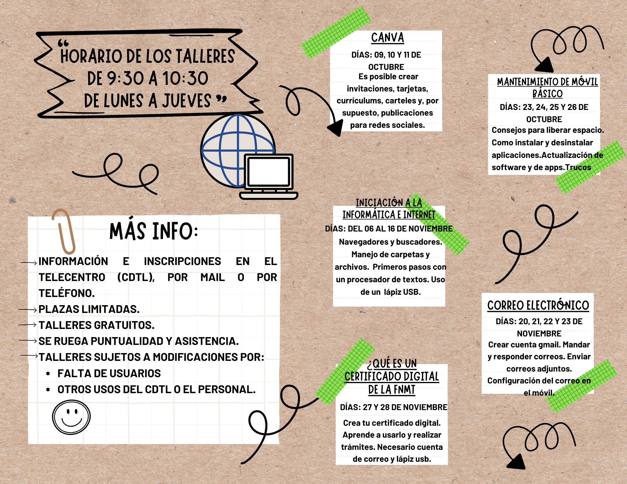 Los talleres son de lunes a jueves en horario de 9:30-10:30 h, información e inscripciones en el CDTL (Telecentro) por mail(cdtl@ayuntamientodellanes.com/cdtllanes@gmail.com) o por teléfono(984 84 31 02) comunicando el taller, datos personales y número de teléfono.