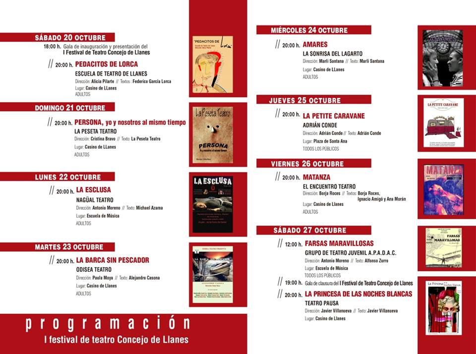 20.00h. Casino de Llanes: PEDACITOS DE LORCA (Escuela de Teatro de Llanes). Dirección: Alicia Pilarte. Textos: Federico García Lorca. Adultos.