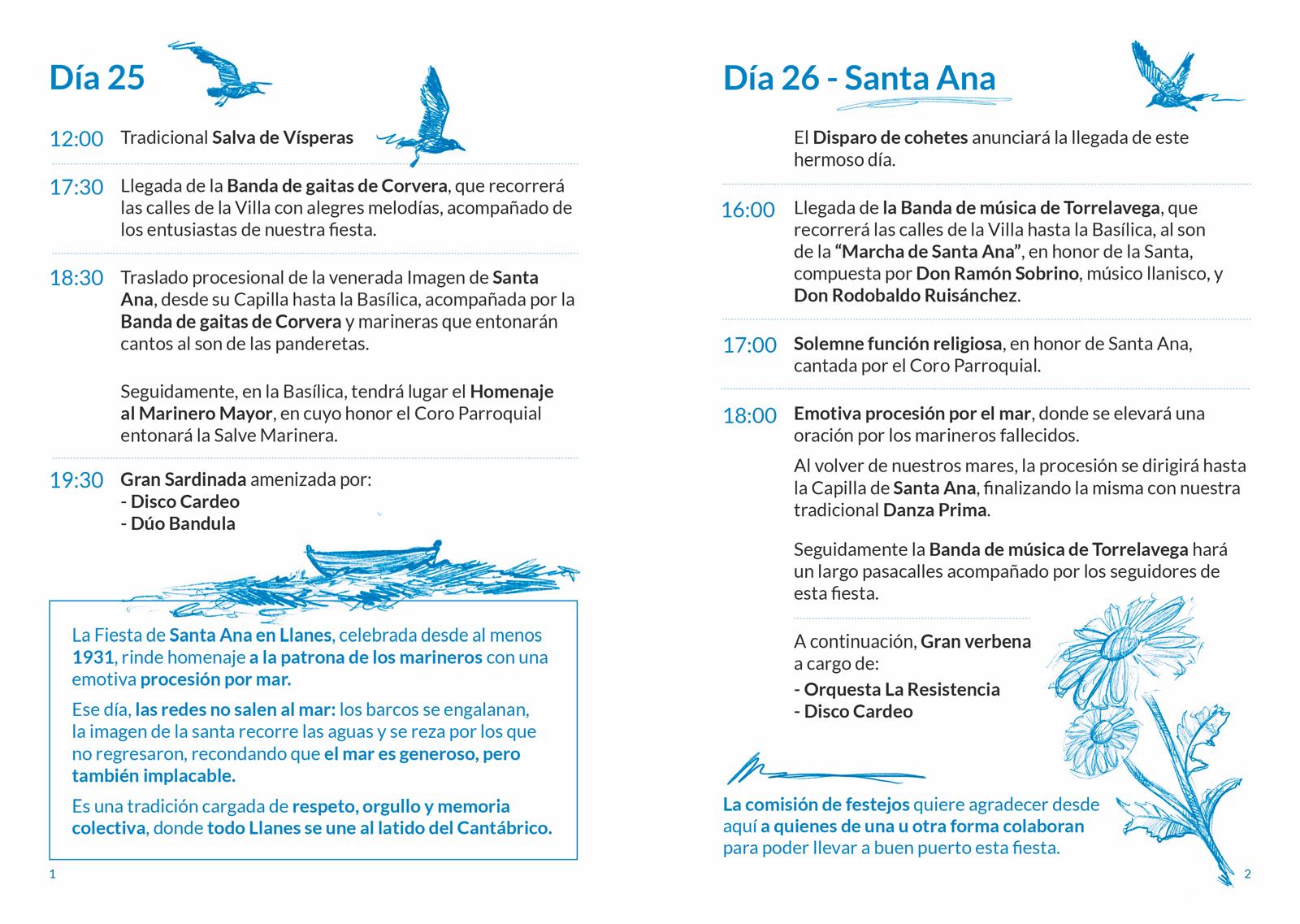 16:00 h. Llegada de la BANDA DE MÚSICA DE TORRELAVEGA, que recorrerá las calles de la Villa hasta la Basílica, al son de la "MARCHA DE SANTA ANA", en honor de la Santa, compuesta por Don Ramóm Sobrino, musicólogo llanisco y Don Rodobaldo Ruisánchez.