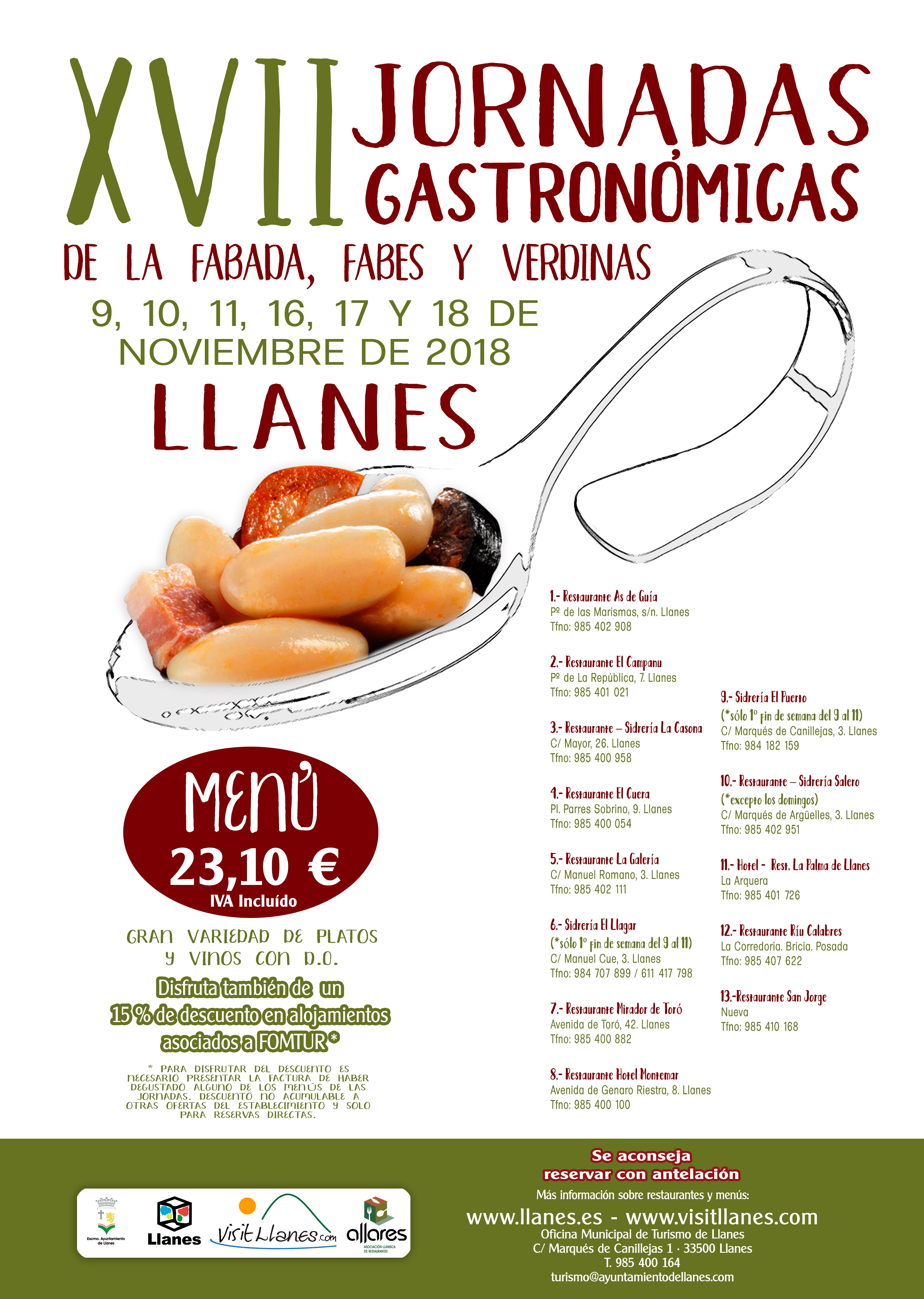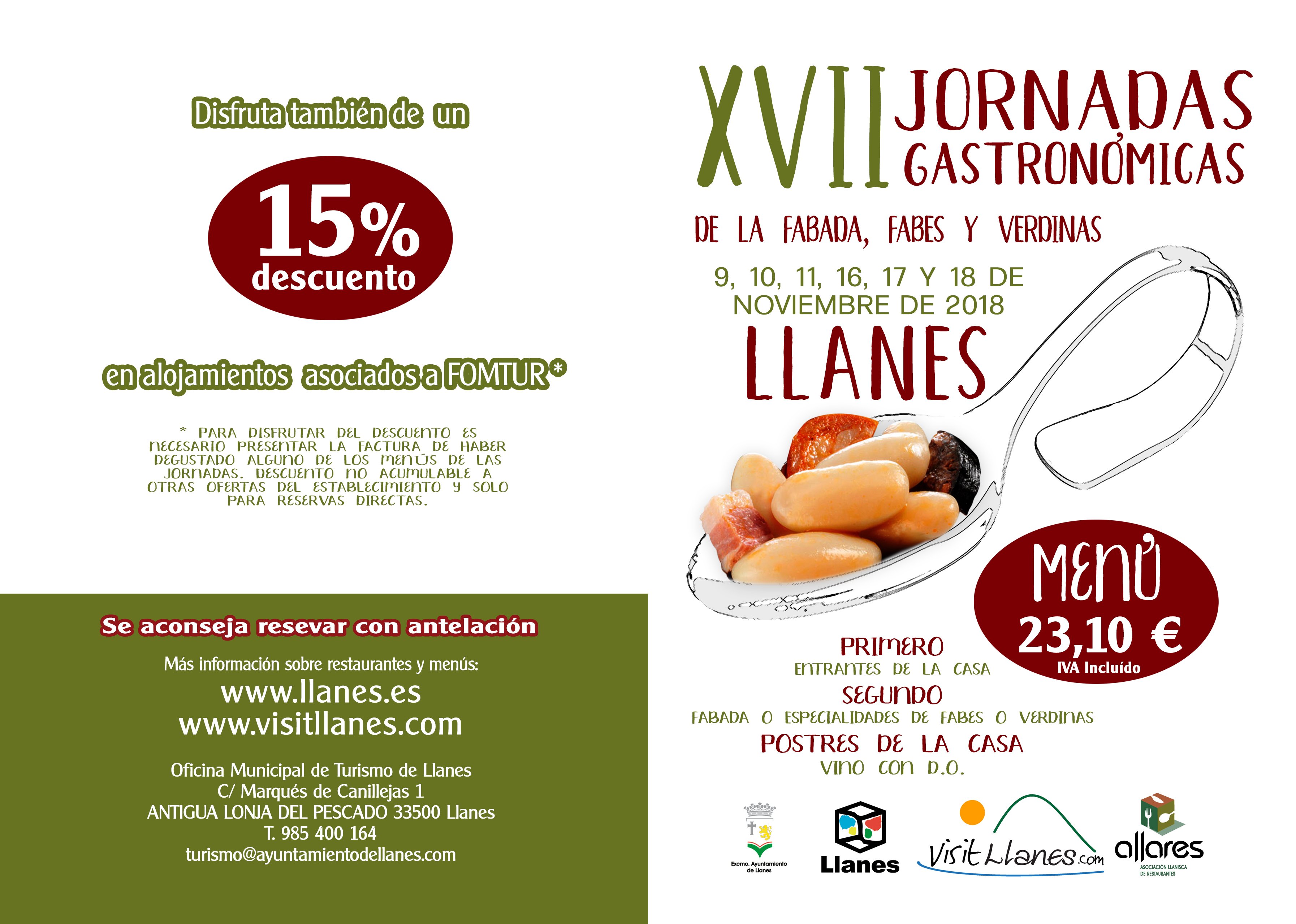 15% de descuento en alojamientos asociados a FOMTUR (para disfrutar del descuento es necesario presentar la factura de haber degustado alguno de los menús de las jornadas. Descuento no acumulable a otras ofertas del establecimiento y solo para reservas directas). Más información sobre los establecimientos participantes en: http://www.visitllanes.com/blog-turismo/xvii-jornadas-gastronomicas-de-la-fabada--fabes-y-verdinas.php?id=346