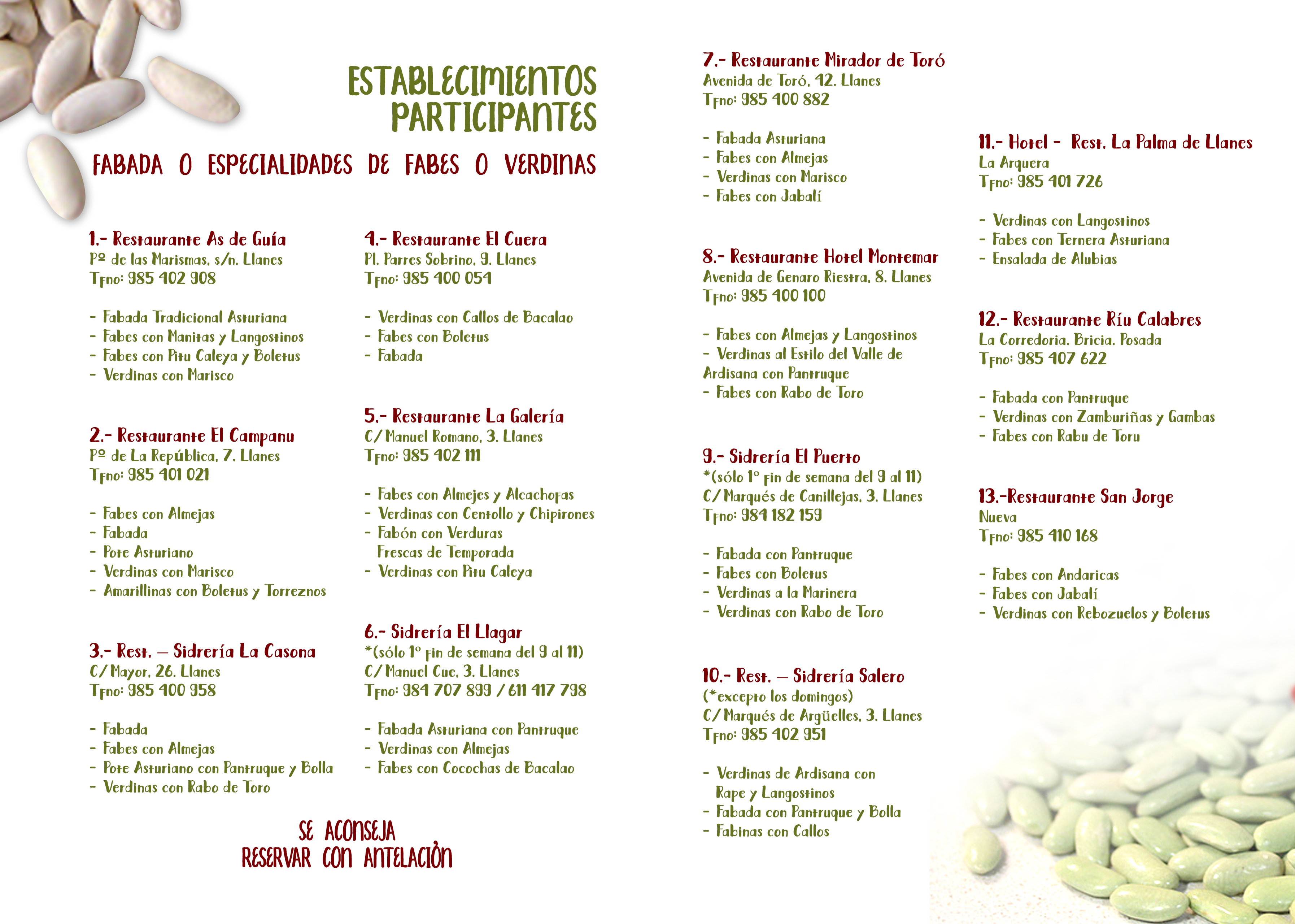 RESTAURANTES PARTICIPANTES Y FABADA O ESPECIALIDADES DE FABES O VERDINAS