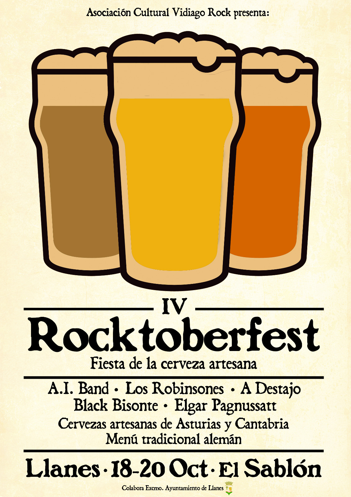 La Asociación Cultural Vidiago Rock finaliza su programación anual celebrando la cuarta edición del Rocktoberfest, Fiesta de la Cerveza Artesana, los días 18, 19 y 20 de octubre en una carpa instalada junto a la playa de El Sablón (Llanes).