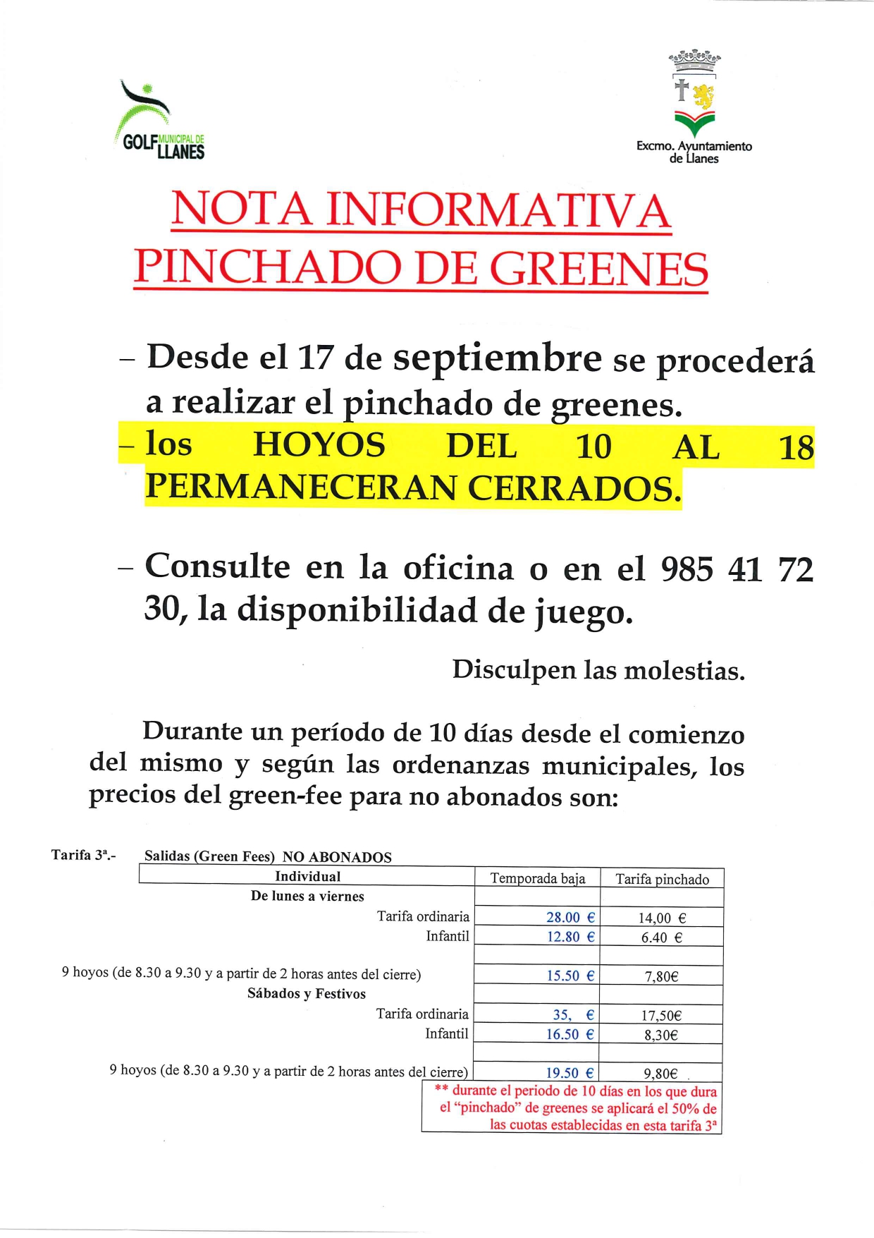 A PARTIR DEL MIERCOLES DÍA 17 DE SEPTIEMBRE, SE PROCEDERÁ A LABORES DE MANTENIMIENTO Y PINCHADO DE GREENS.