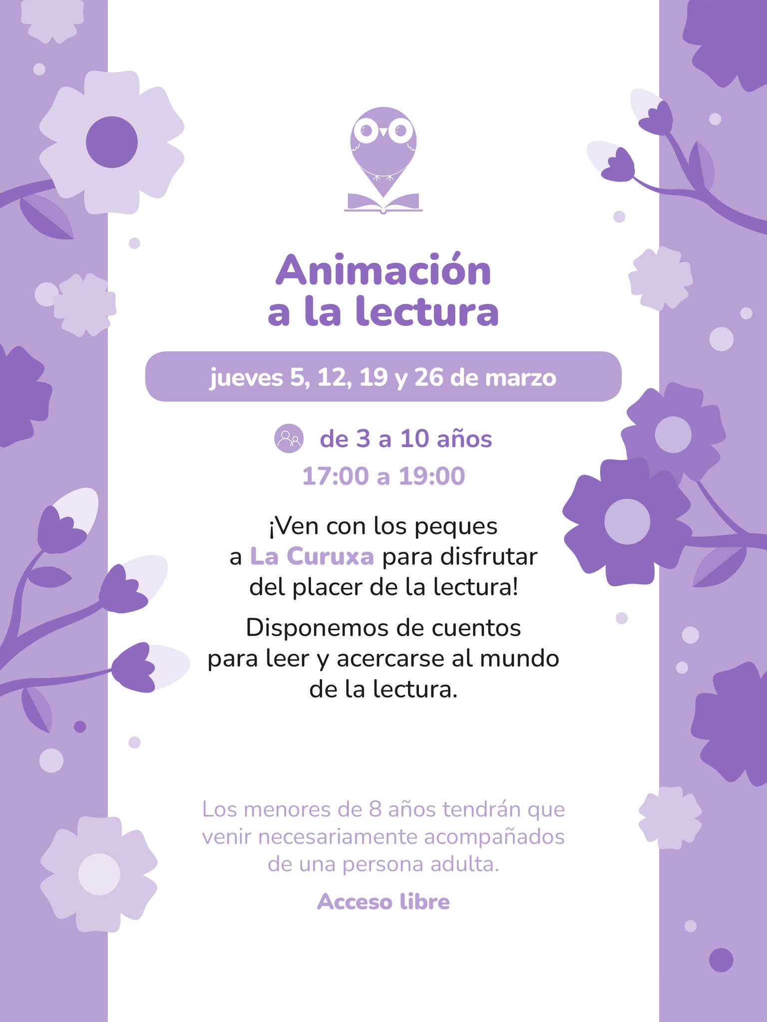 Jue 5, 12, 19 y 26 · 17:00–19:00 — Animación a la lectura (3–10 años). Acceso libre. Menores de 8 años, acompañados de una persona adulta.