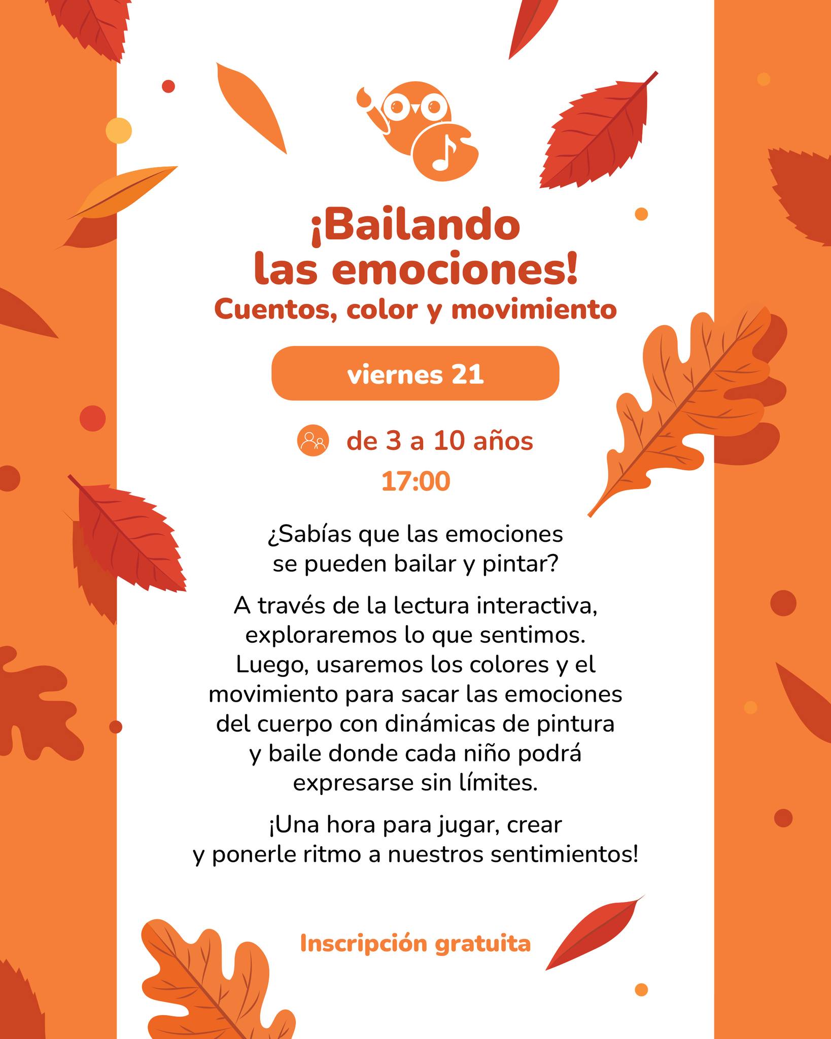 - Viernes 21 · 17:00 — ¡Bailando las emociones! Cuentos, color y movimiento (3-10 años). Inscripción gratuita por teléfono.