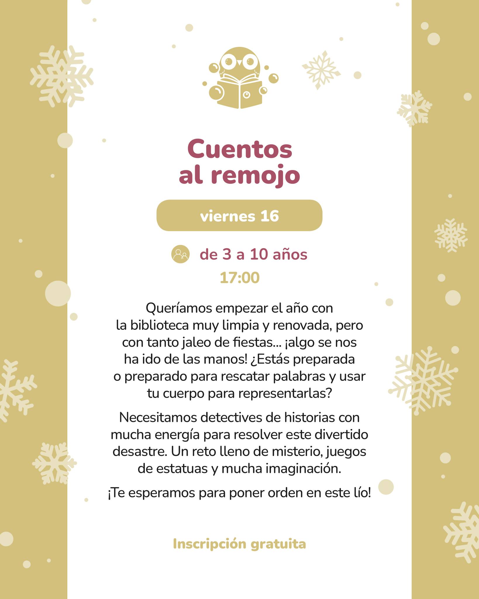 Vie 16 · 17:00 — Cuentos al remojo (3–10 años). Inscripción gratuita por teléfono.