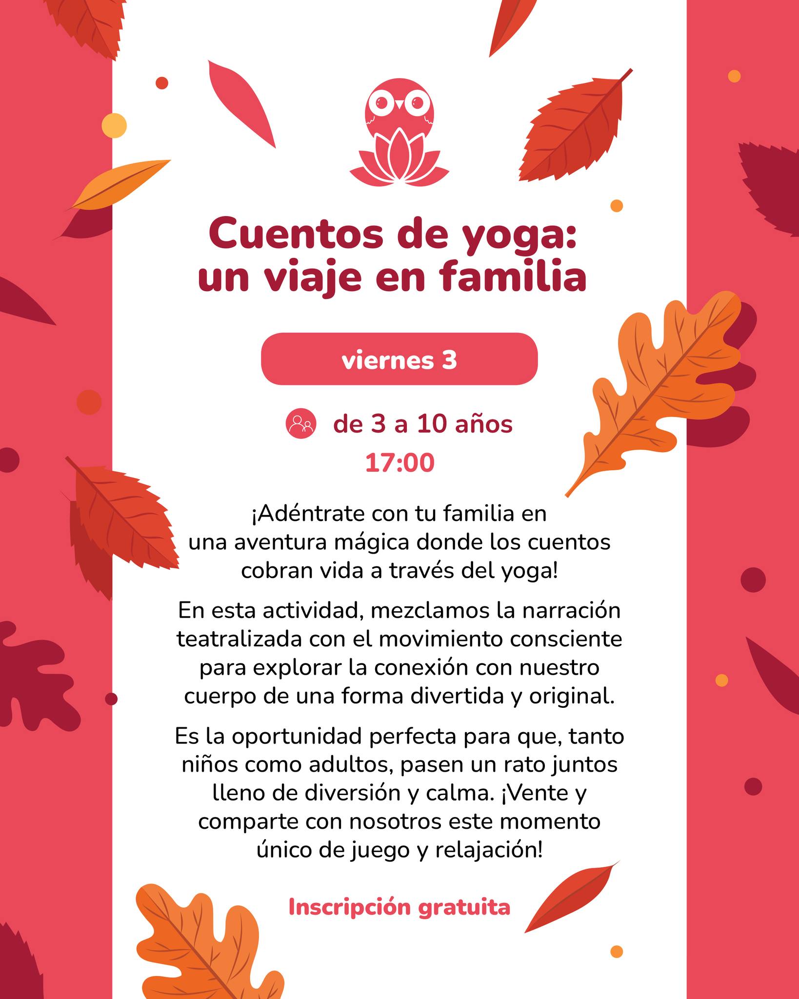- Viernes 3 · 17:00 — Cuentos de yoga: un viaje en familia (3–10 años). Inscripción gratuita por teléfono.