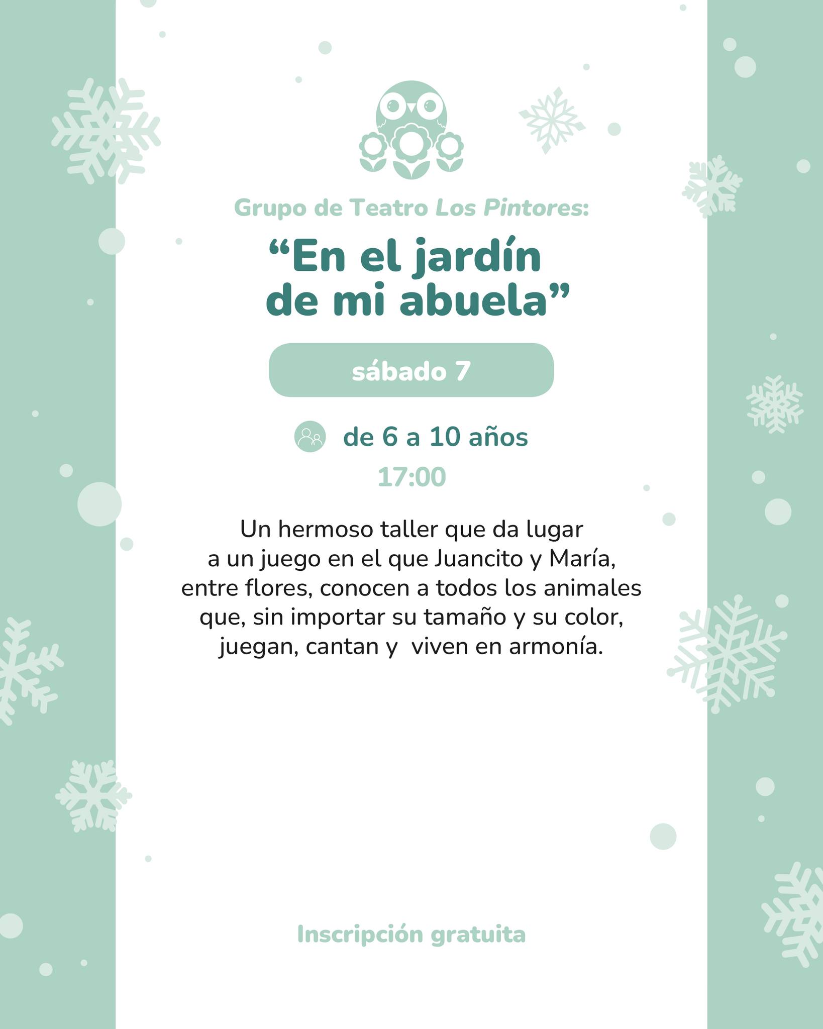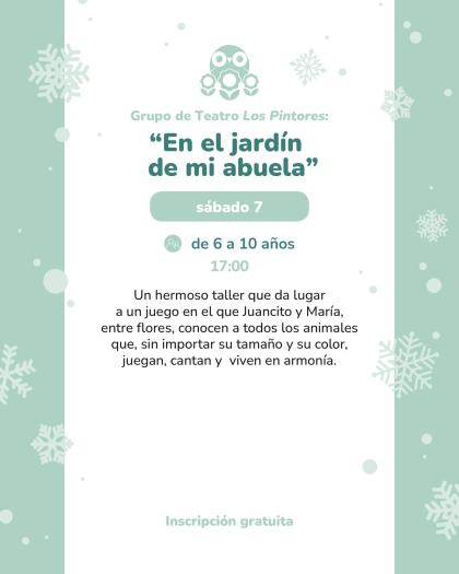 Sáb 7 · 17:00 — Grupo de Teatro Los Pintores: “En el jardín de mi abuela” (6–10 años). Taller-juego teatral. Inscripción gratuita por teléfono.