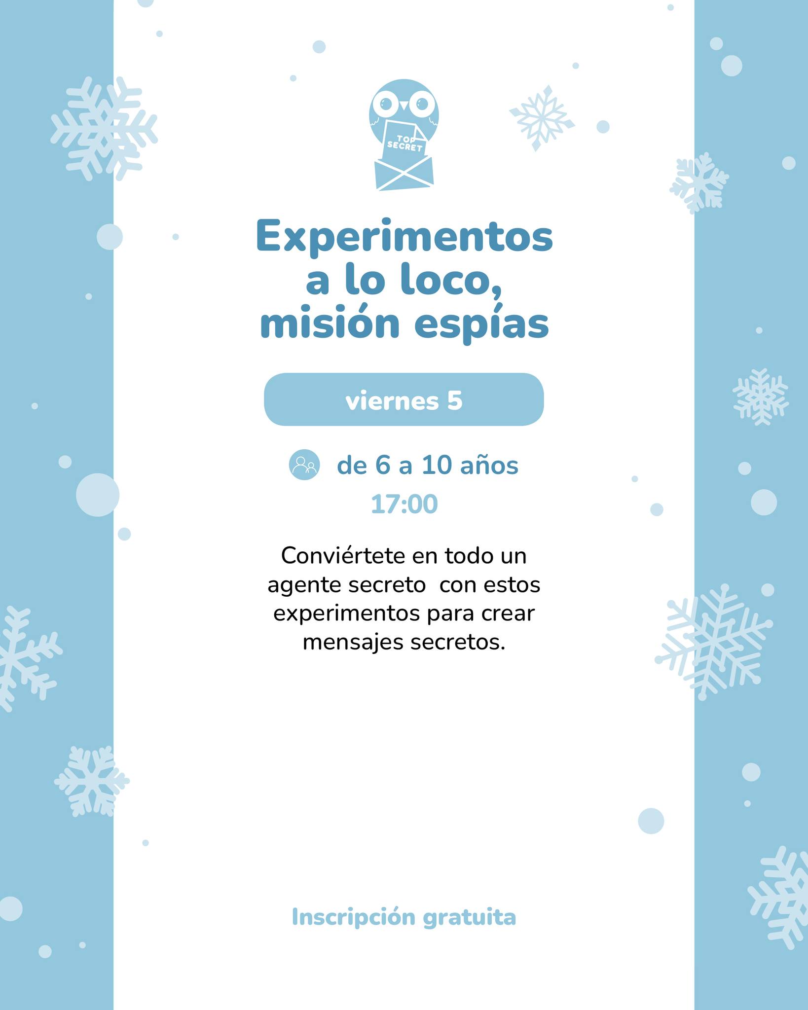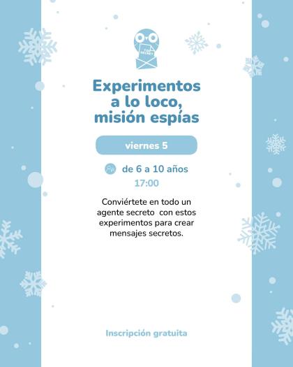 - Viernes 5 · 17:00 — Experimentos a lo loco, misión espías (6–10 años). Inscripción gratuita por teléfono.