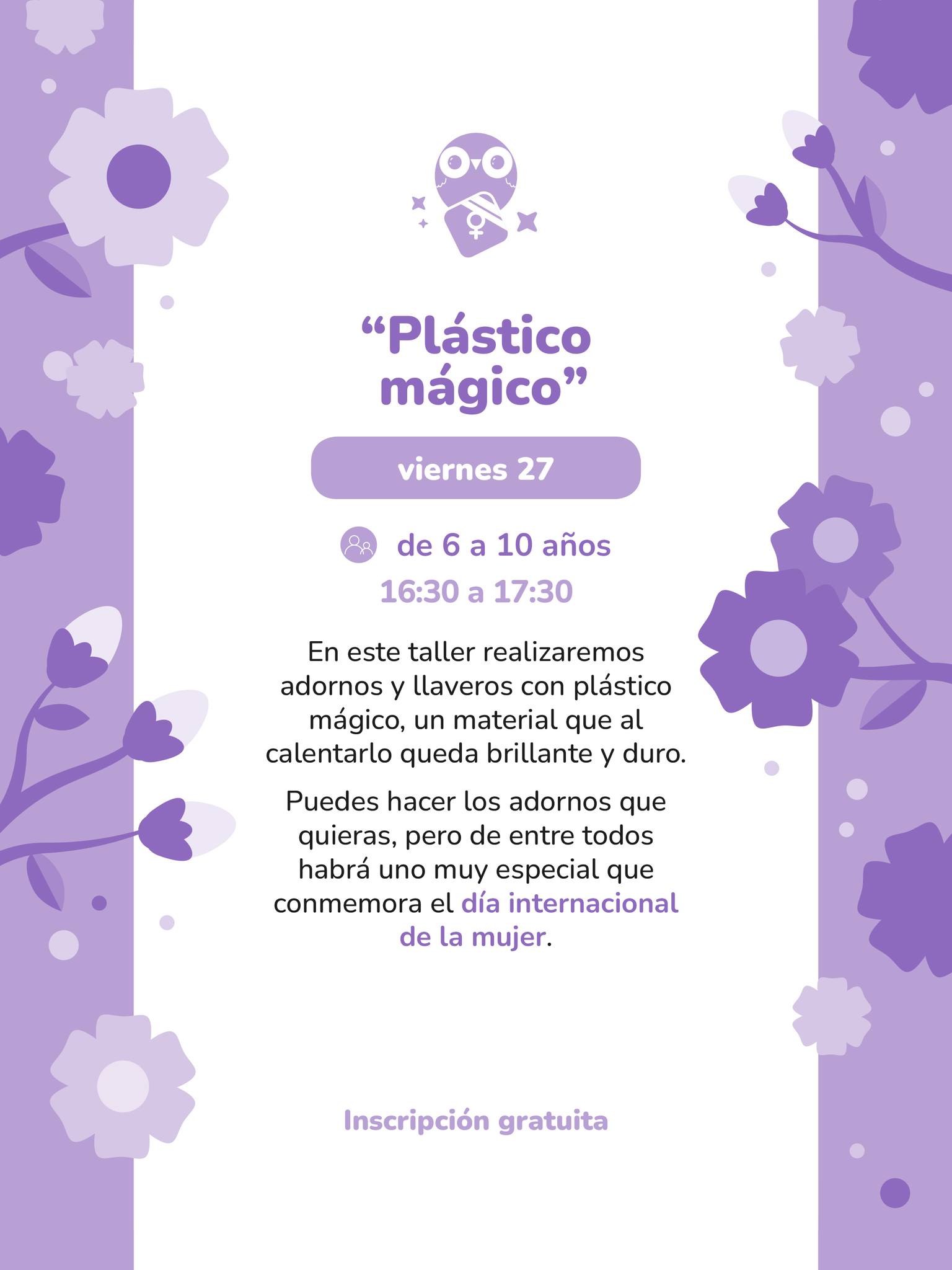 Vie 27 · 16:30–17:30 — “Plástico mágico” (6–10 años). Inscripción gratuita por teléfono.