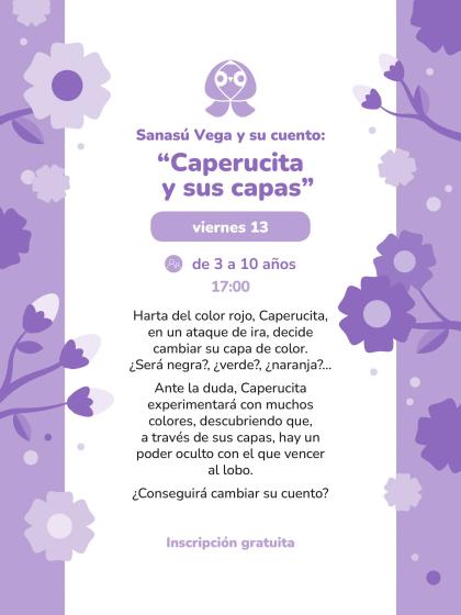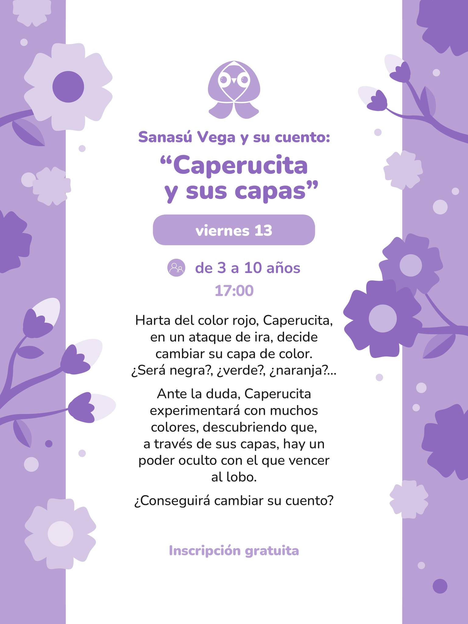 Vie 13 · 17:00 — Sanasú Vega y su cuento: “Caperucita y sus capas” (3–10 años). Inscripción gratuita por teléfono.