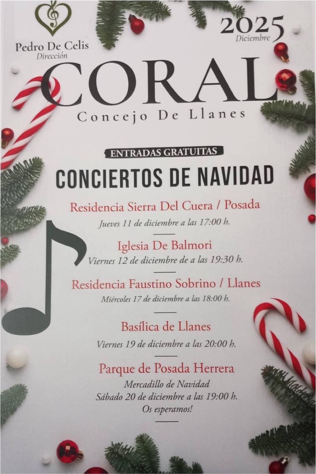 La Agrupación “Coral Concejo de Llanes” ofrece un Concierto Navideño, el sábado 20 de diciembre a las 19:00 horas en el Mercadillo de Navidad instalado en el parque Posada Herrera de Llanes. Habrá chocolate caliente para todos los asistentes.