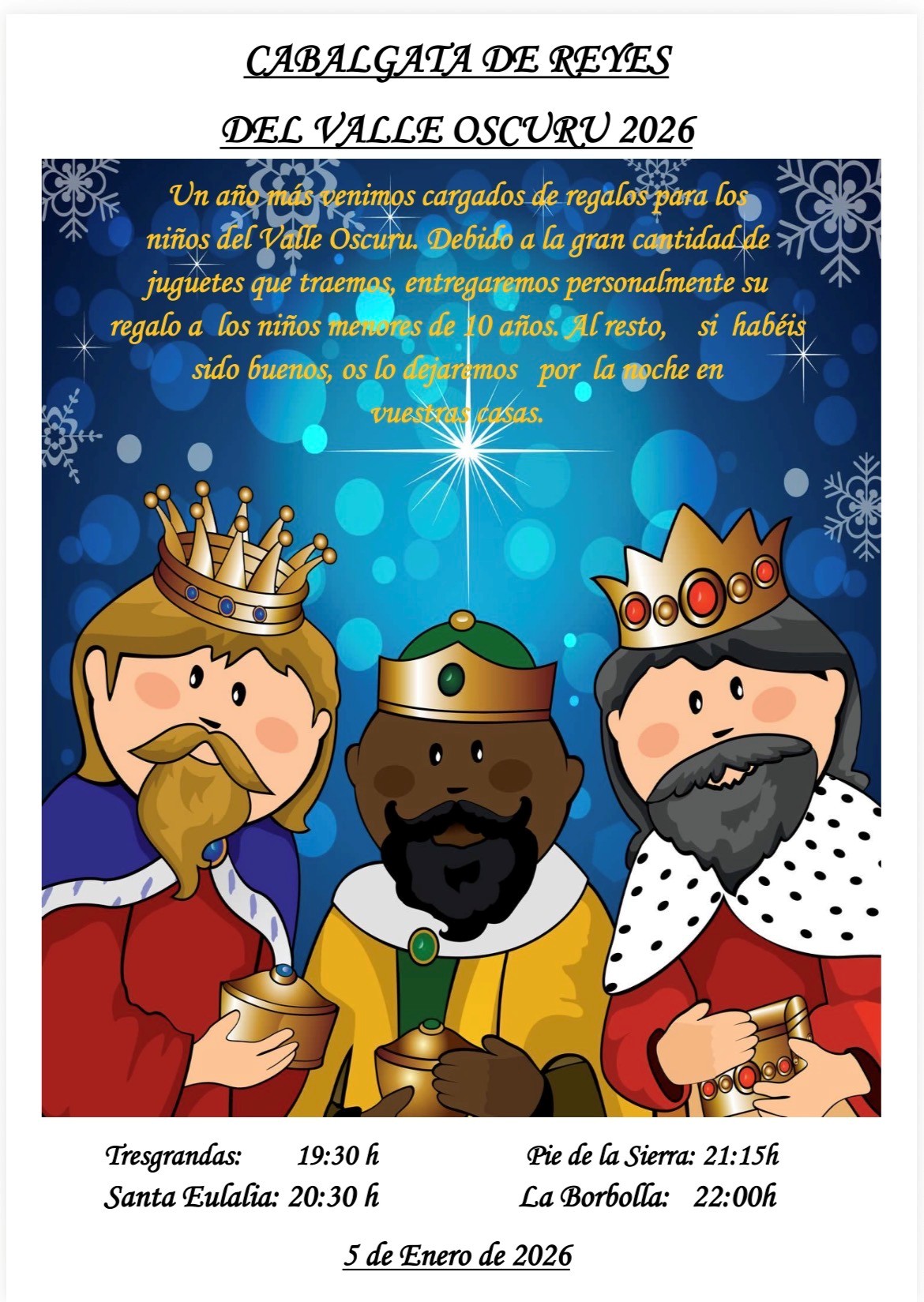 En el Valle Oscuru se realizará una Cabalgata de Reyes que recorrerá las distintas localidades del valle. Así, Melchor, Gaspar y Baltasar pasarán por Tresgrandas a las 19:30 h., por Santa Eulalia a las 20:30 h., por Pie de la Sierra a las 21:15 h. y por La Borbolla a las 22:00 h.