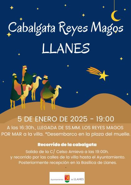 A partir de las 19:00 horas iniciará su recorrido LA CABALGATA DE LOS REYES MAGOS acompañados de una comitiva real además de la Banda y Bandina de Tambores y Gaitas del Llacín y de una legión de la antigua Roma. Saliendo del Instituto sus majestades harán el recorrido habitual por las calles de Llanes con parada en el Ayuntamiento donde una vez más demostrarán su magia. En el Ayuntamiento SS.MM. serán recibidos por la Corporación Municipal. Desde el balcón del Ayuntamiento se dirigirán a todos los presentes y a continuación se dirigirán a la Basílica donde recibirán personalmente a todos los niños y niñas que se acerquen a ellos.