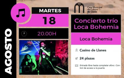 - Concierto del trío “Loca Bohemia” (tango), formado por Alejandro Regine (voz), Nico Córdoba Olivos (bandoneón) y María Cueva Méndez (piano). (Martes 18, 20:00 h., en el Casino).