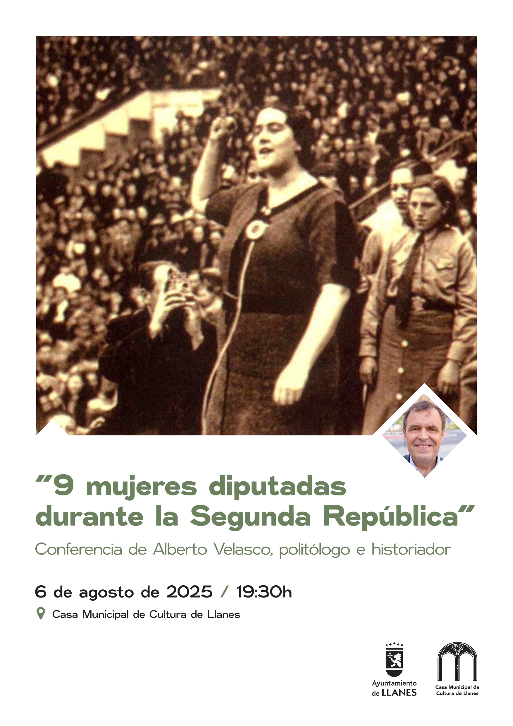 El miécoles 6 de agosto, a las 19:30 h., en la Casa Municipal de Cultura de Llanes, conferencia de Alberto Velasco: "9 Mujeres Diputadas durante la Segunda Republica Española".