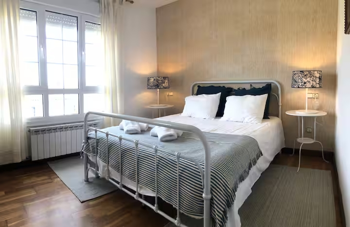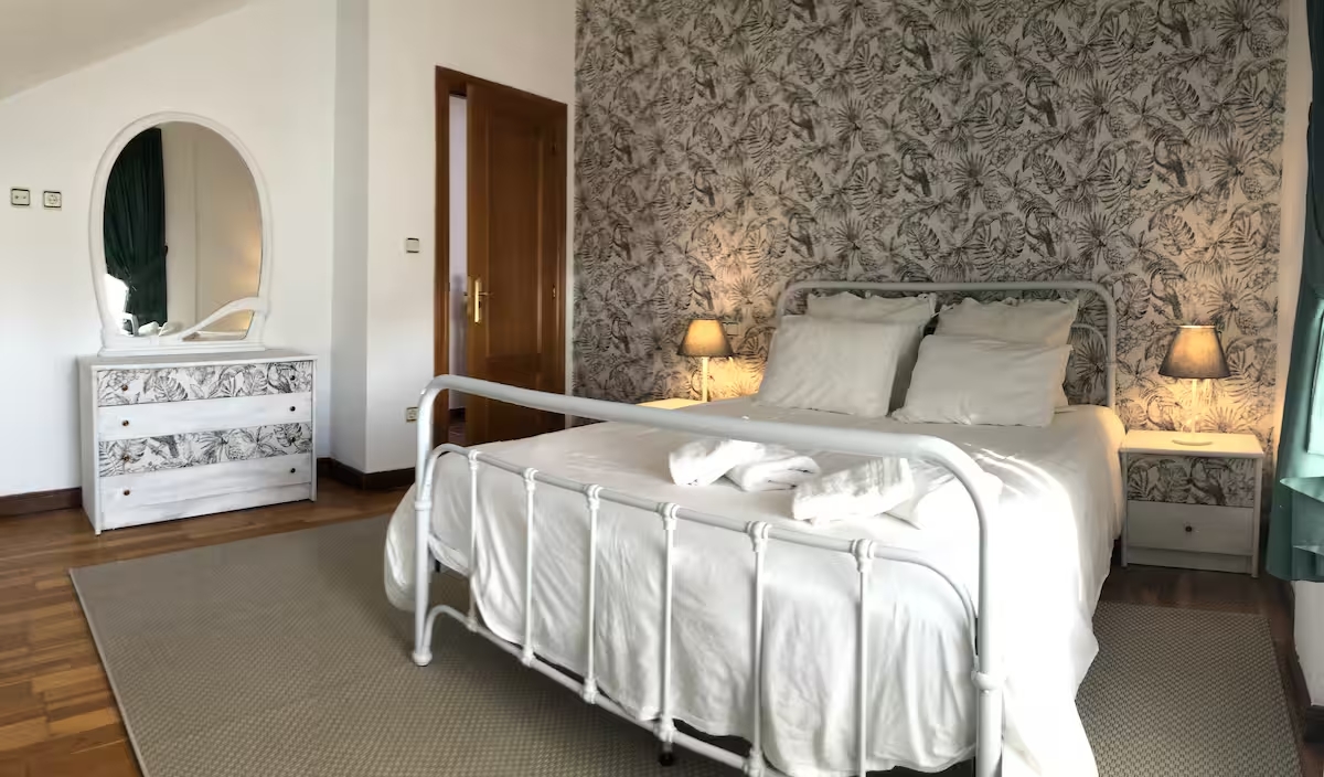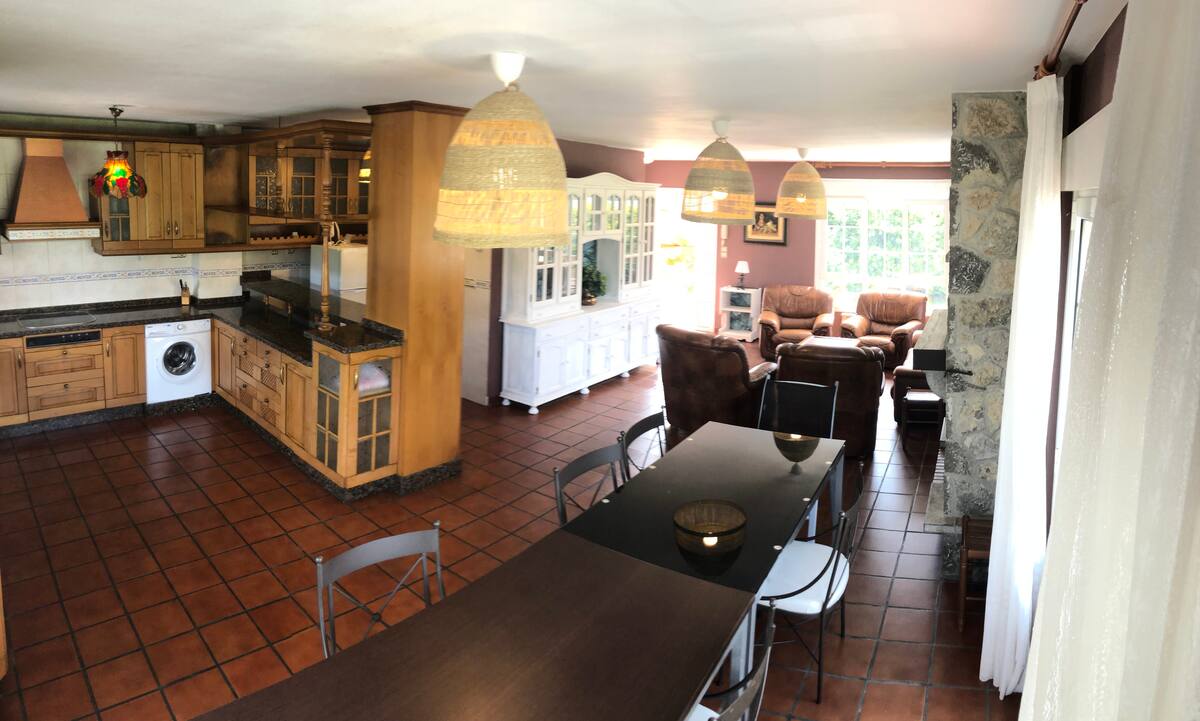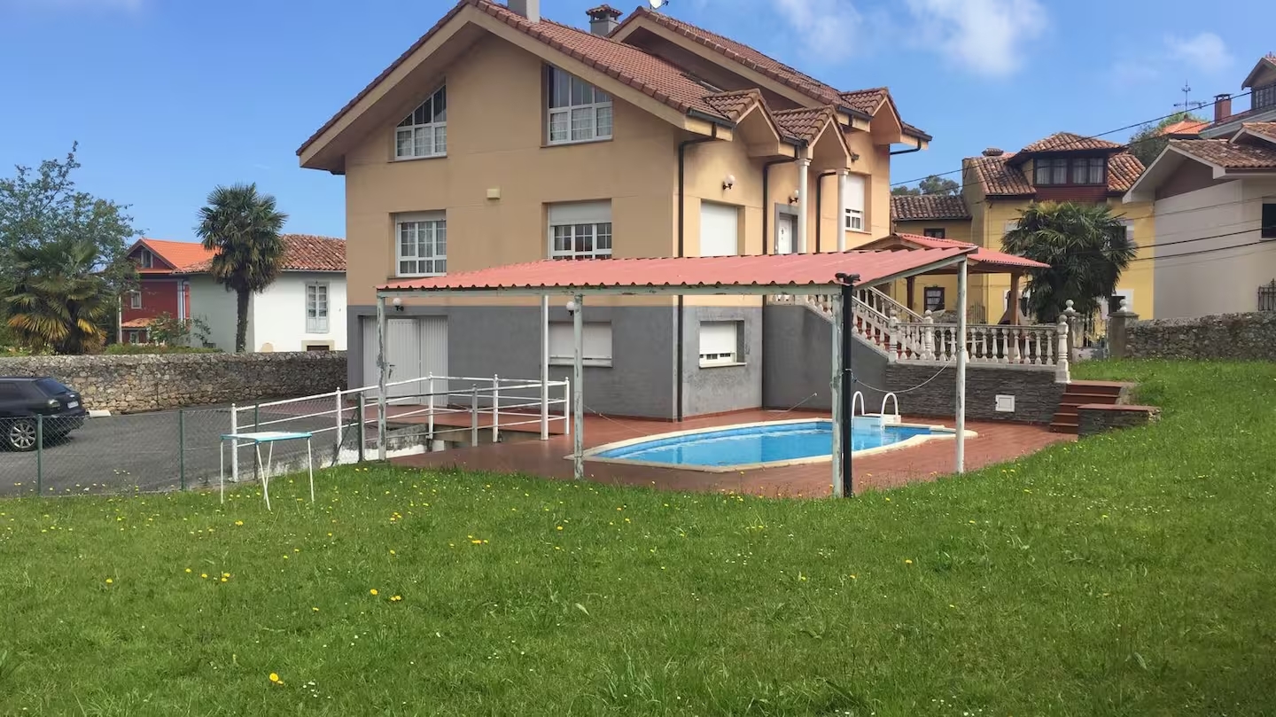 Preciosa villa individual con piscina privada y bello jardín, aparcamientos privados, zona de barbacoa con cenador, cocina americana completa, dos habitaciones matrimoniales, dos dobles, buhardilla con cinco camas y dos baños completos. Situada en el centro del pueblo de Nueva de Llanes a 5 minutos de la playa de cuevas del mar.