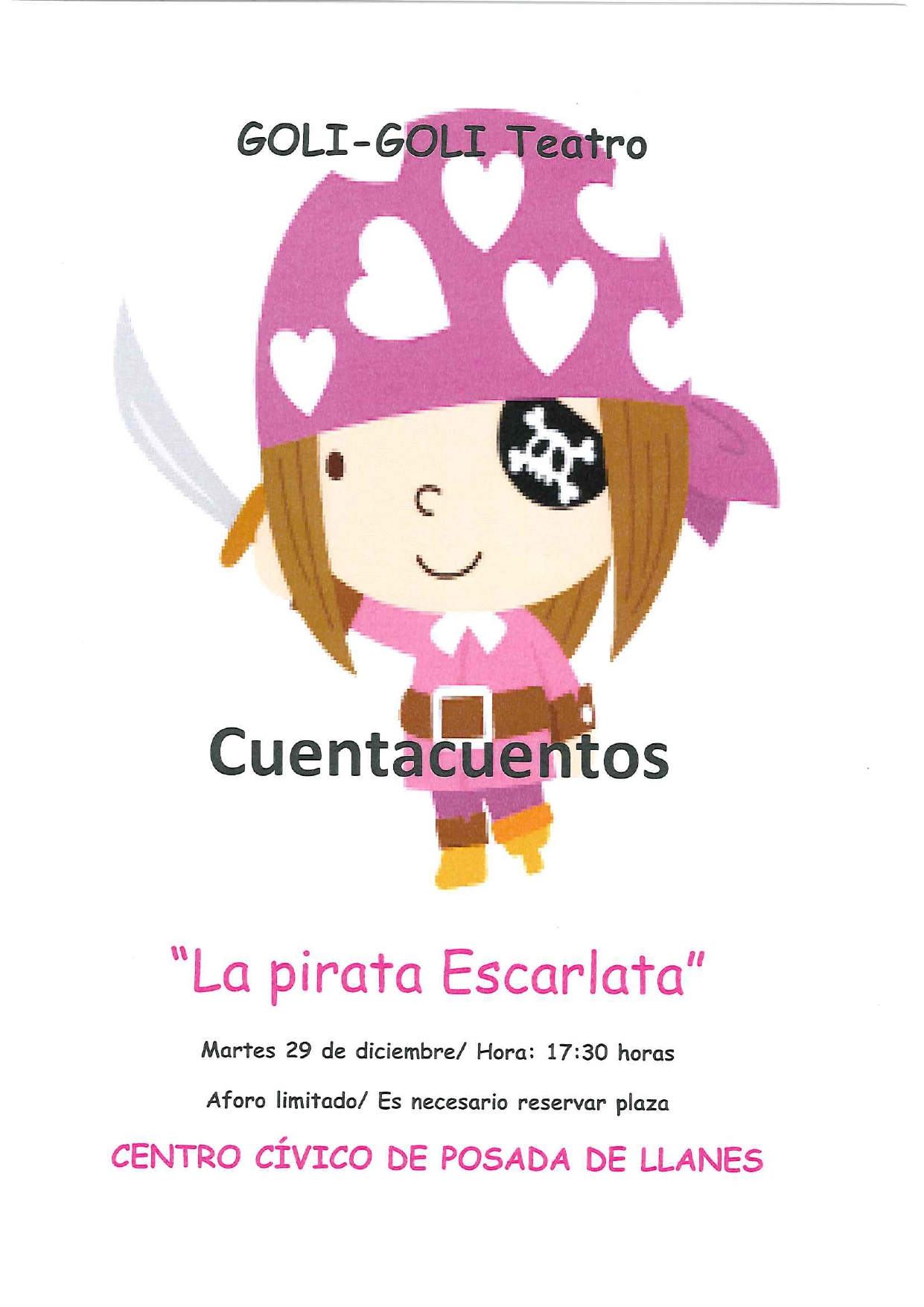 El martes 29 de diciembre llega la Compañía GOLI-GOLI Teatro acompañada de la Pirata Escarlata y la Chelista Sara en su barco el "Malasombra que asombra" para contar y cantar historias de piratas, monstruos y demás personajes que han ido conociendo, mientras surcaban los mares para hacer disfrutar a los más peques.