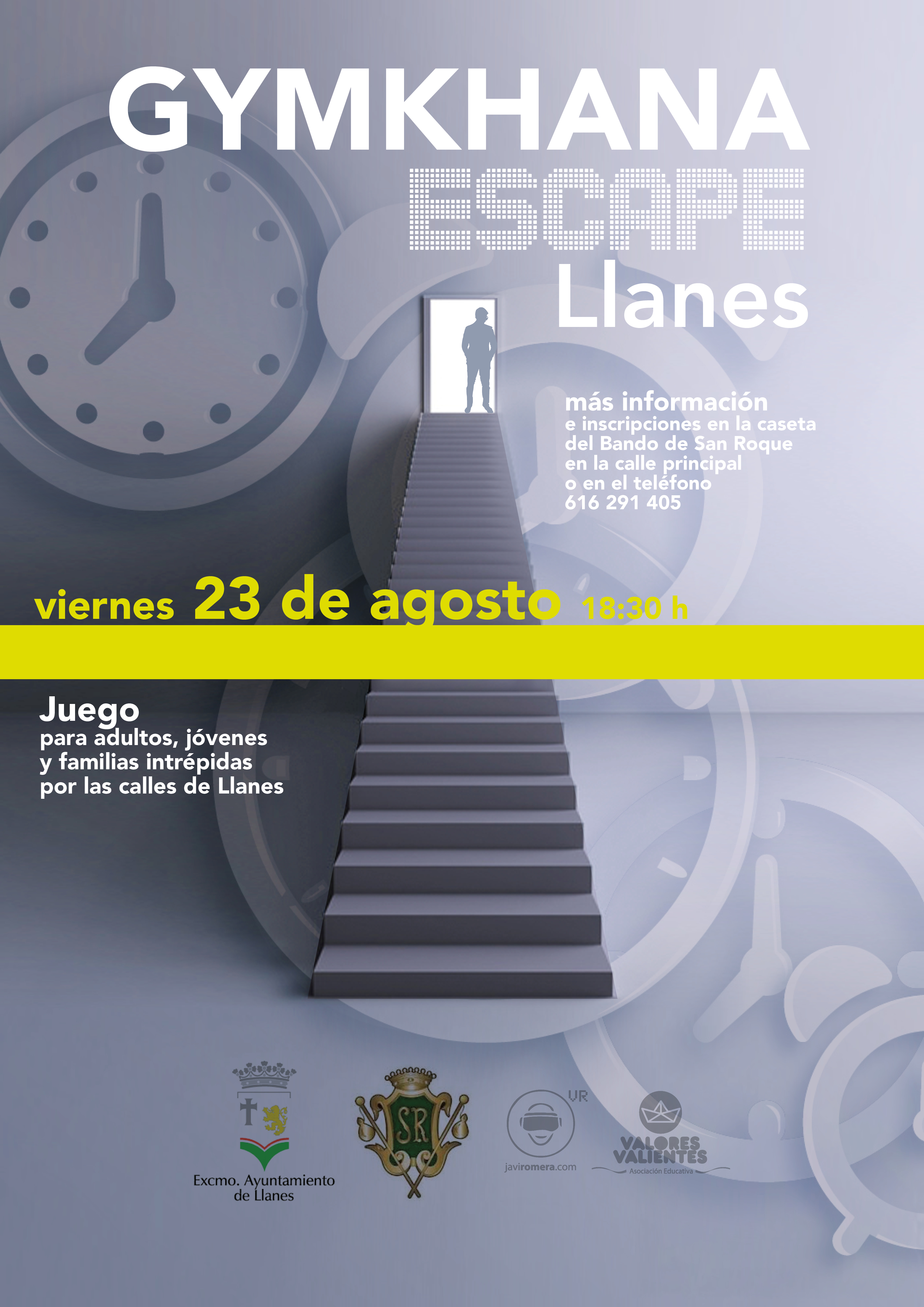 A las 18,30 h, GYMKANA ESCAPE del Bando de San Roque (Inscripciones en la caseta del Bando o en el teléfono 616 291 415 ). Juego para adultos, jóvenes y familias intrépidas por las callles de Llanes.