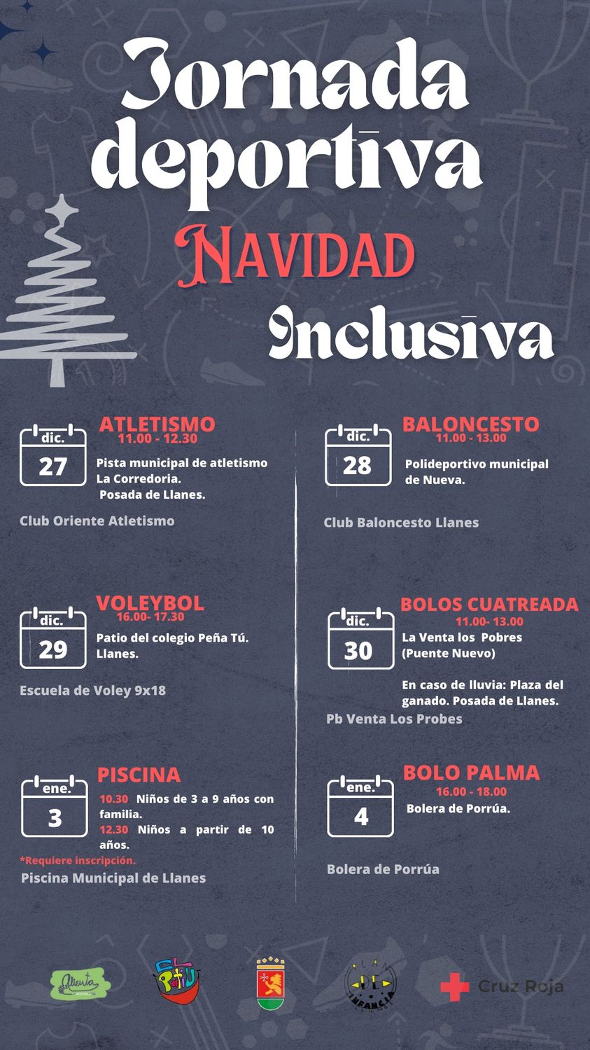 El Ayuntamiento de Llanes, a través del Plan de Infancia, y con la colaboración de la concejalía de Deportes, gestionada por Iván García, así como de diversos clubes deportivos y asociaciones del municipio, organiza unas jornadas deportivas inclusivas para estas fechas navideñas. La participación en las mismas será gratuita, y contarán con monitores deportivos que facilitarán la adaptación. Estas jornadas se desarrollarán en diversos puntos del concejo: Posada, Nueva, Llanes, La Venta los Probes, y Porrúa.