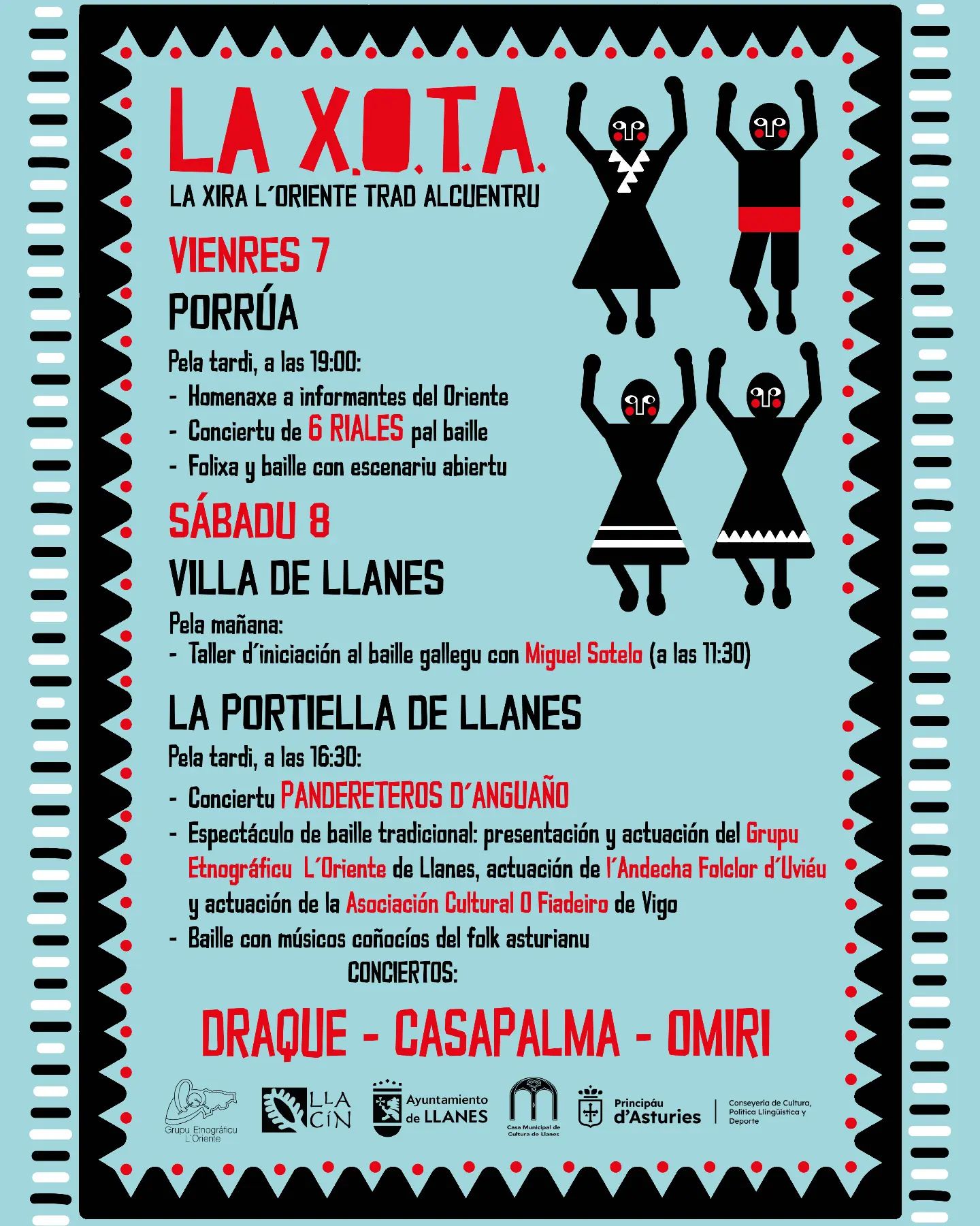 La X.O.T.A. ofrecerá al público un festival de música y baile que se inspira en la tradición oral, pero en el que también tendrán cabida actuaciones de vanguardia. Conciertos y bailes, pero también talleres, homenajes y “mucha folixa” tendrán su espacio en esta Xira l’Oriente, cuyo programa detallado se desgranará en los próximos días, y cuyas sedes estarán en Porrúa, Llanes y La Portilla.