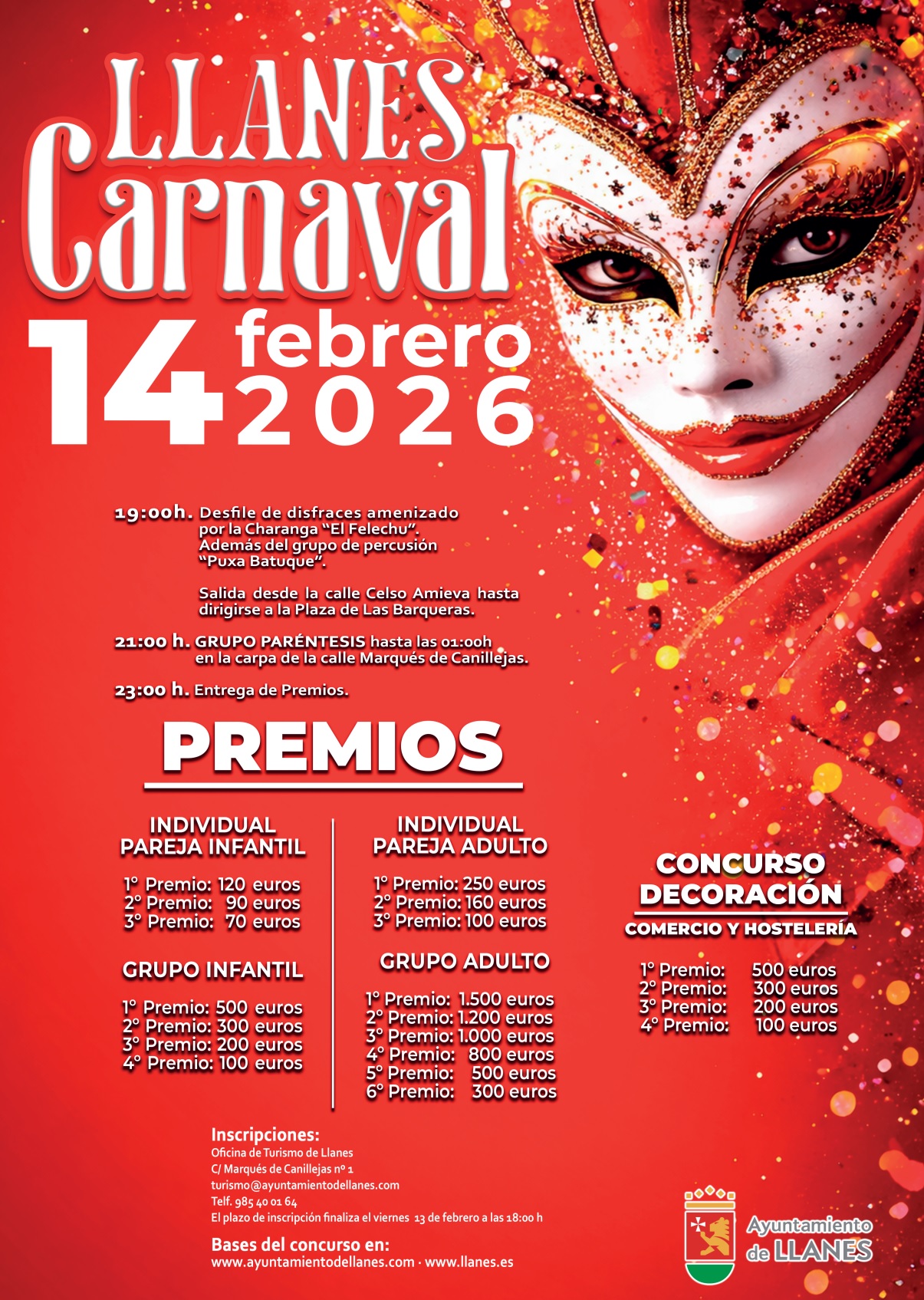 1. El Ayuntamiento de Llanes convoca el Concurso de Disfraces “Carnaval Llanes 2026”. Podrán participar cuantas personas lo deseen con el único requisito de inscribirse previamente en la Oficina de Turismo en C/ Marqués de Canillejas, 1 (Antigua Lonja de Pescado), en horario de martes a sábado de 10:00 a 14:00 y de 16:00 a 18:30 h. Teléfono: 985 400 164. E-mail: turismo@ayuntamientodellanes.com. El plazo de inscripción se inicia al día siguiente de la publicación en el Boletín Oficial del Principado de Asturias (comienza el sábado 31 de enero) y finaliza el viernes 13 de febrero a las 18:00 h.