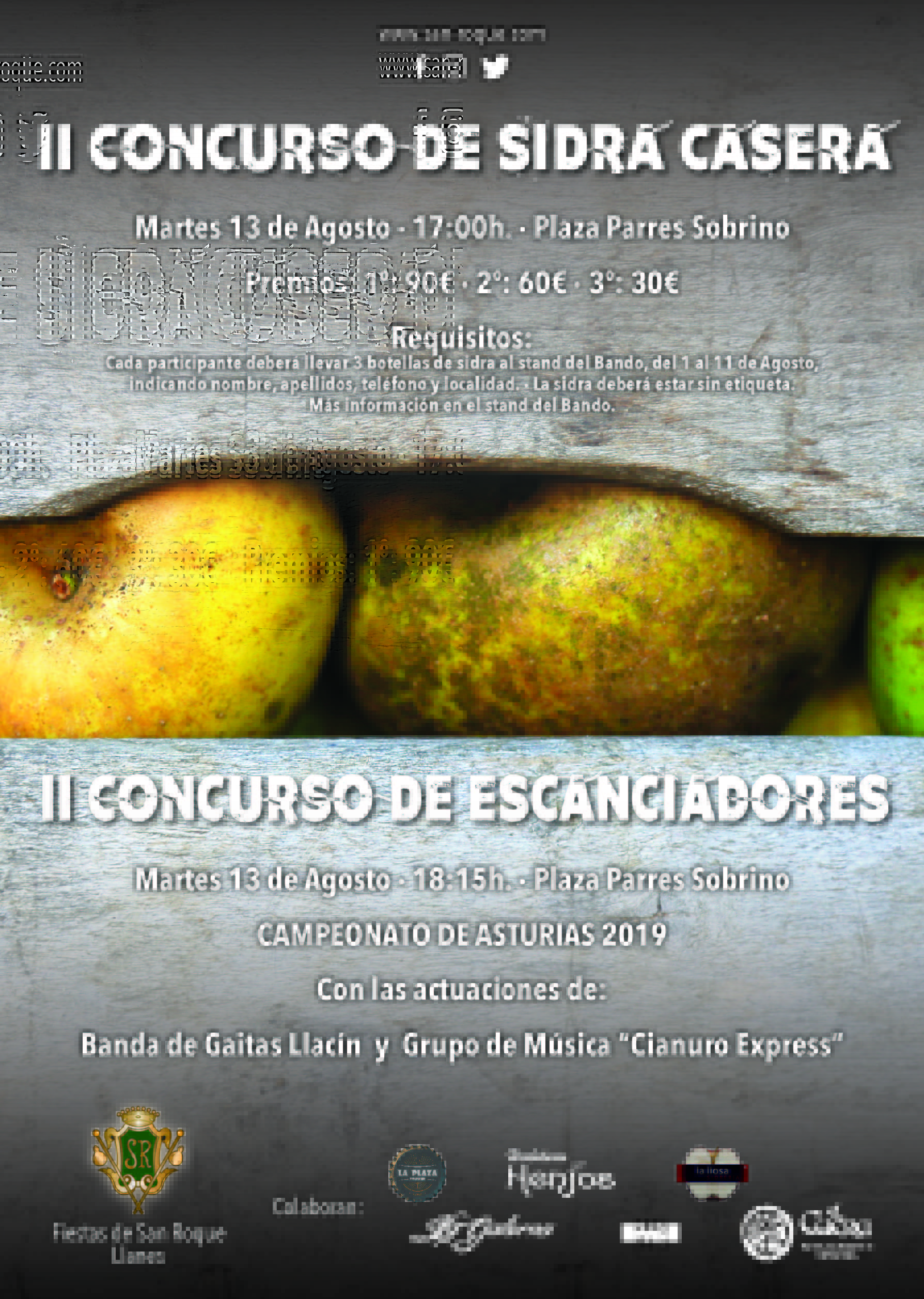 Martes, DÍA 13. A las 18,00 h, en la Plaza de Parres Sobrino, II Concurso de Sidra Casera como previo al II CONCURSO DE ESCANCIADORES DEL BANDO DE SAN ROQUE, prueba puntuable para el XXVI CAMPEONATO OFICIAL DE ESCANCIADORES DE ASTURIAS.