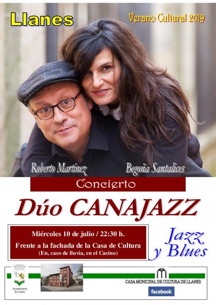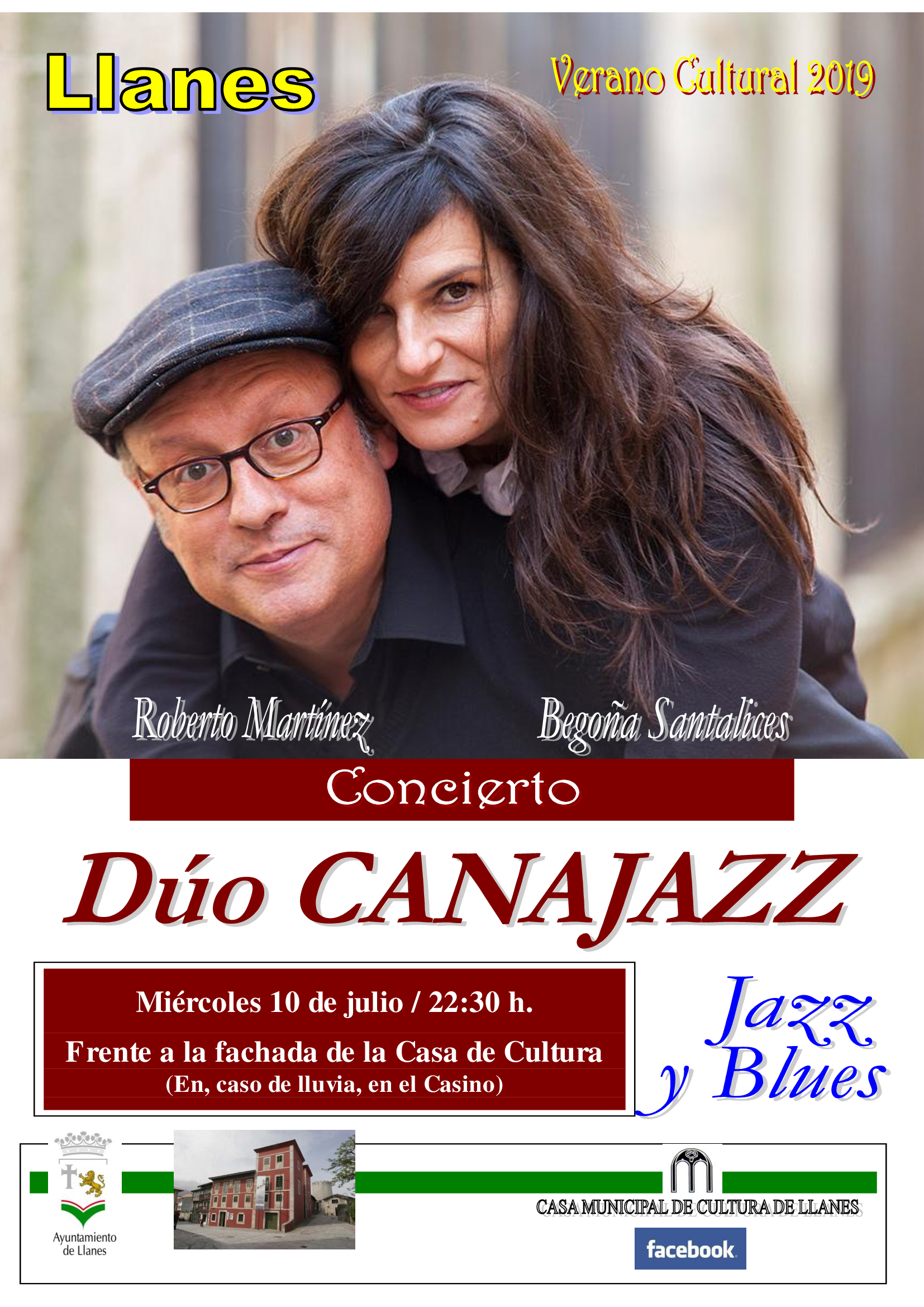 - 22:30 h. Recital del Dúo “Canajazz”, formado por el guitarrista Roberto Martínez y la cantante y actriz Begoña Santalices. (Frente a la Casa de Cultura. En caso de lluvia, en el Casino).