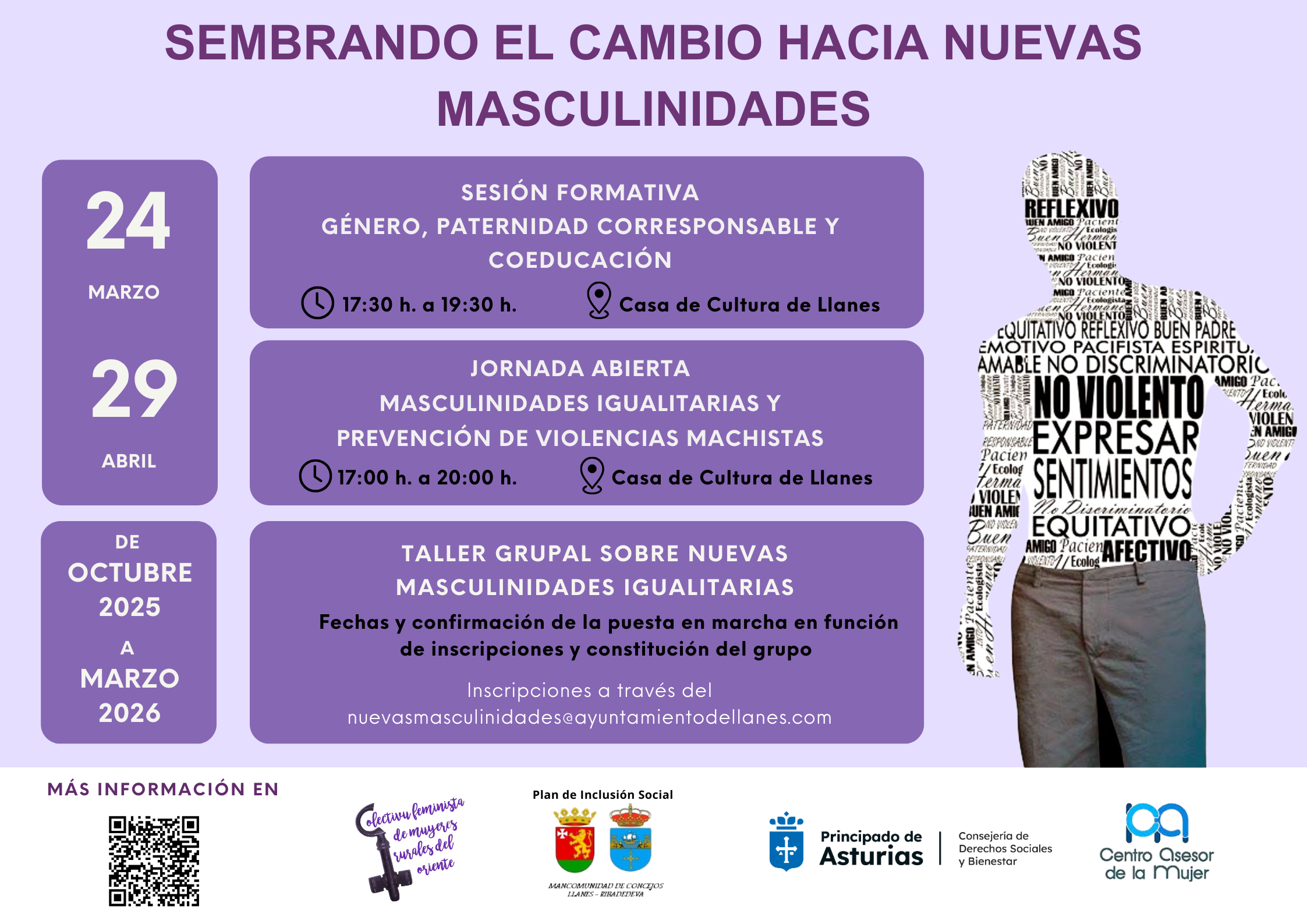 - 29 abril: Jornada abierta sobre masculinidades igualitarias y prevención de violencias machistas. Dirigida y abierta a la participación de toda la comunidad. Con esta jornada se pretende crear un espacio de análisis y debate comunitario sobre las consecuencias de la desigualdad de género y la necesidad de construir nuevos modelos de masculinidad basados en la igualdad, la justicia y la no discriminación hacia la mujer. Se realizará en la Casa de Cultura de Llanes en horario 17:00 a 20:00 h.