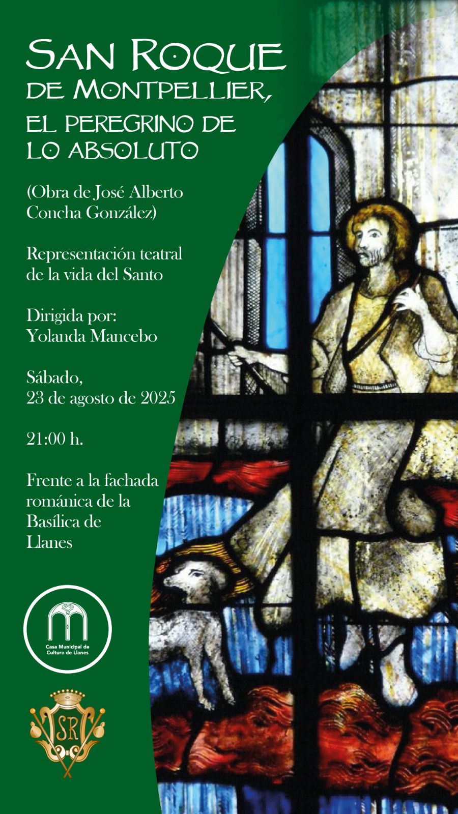 A las 21:00 h., ante el pórtico románico de la Basílica de Llanes, REPRESENTACIÓN TEATRAL de la obra “SAN ROQUE DE MONTPELLIER, EL PEREGRINO DE LO ABSOLUTO”, dirigida por Yolanda Mancebo.