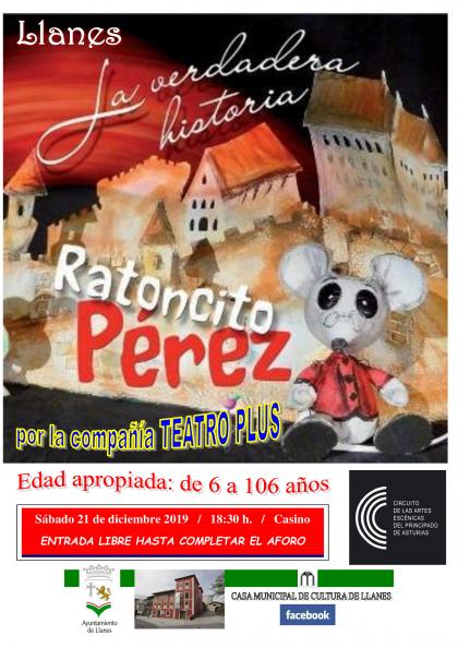 Teatro PLUS presenta su versión del cuento original de Luis Coloma "Ratón Pérez". Escrito en 1894, como regalo al Rey Alfonso XIII que entonces tenía 8 años y se le cayó un diente de leche. Está inspirado en los hechos históricos relacionados con la vida de este Rey de España. Por eso el título: "Ratoncito Pérez, la verdadera historia".