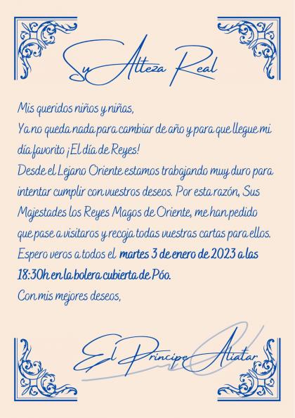 Visita del Principe Aliatar y recogida de cartas, el martes 3 de enero a las 18:30 h., en la Bolera Cubierta de Poo.