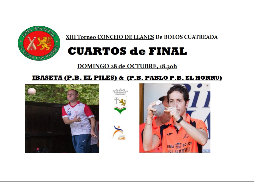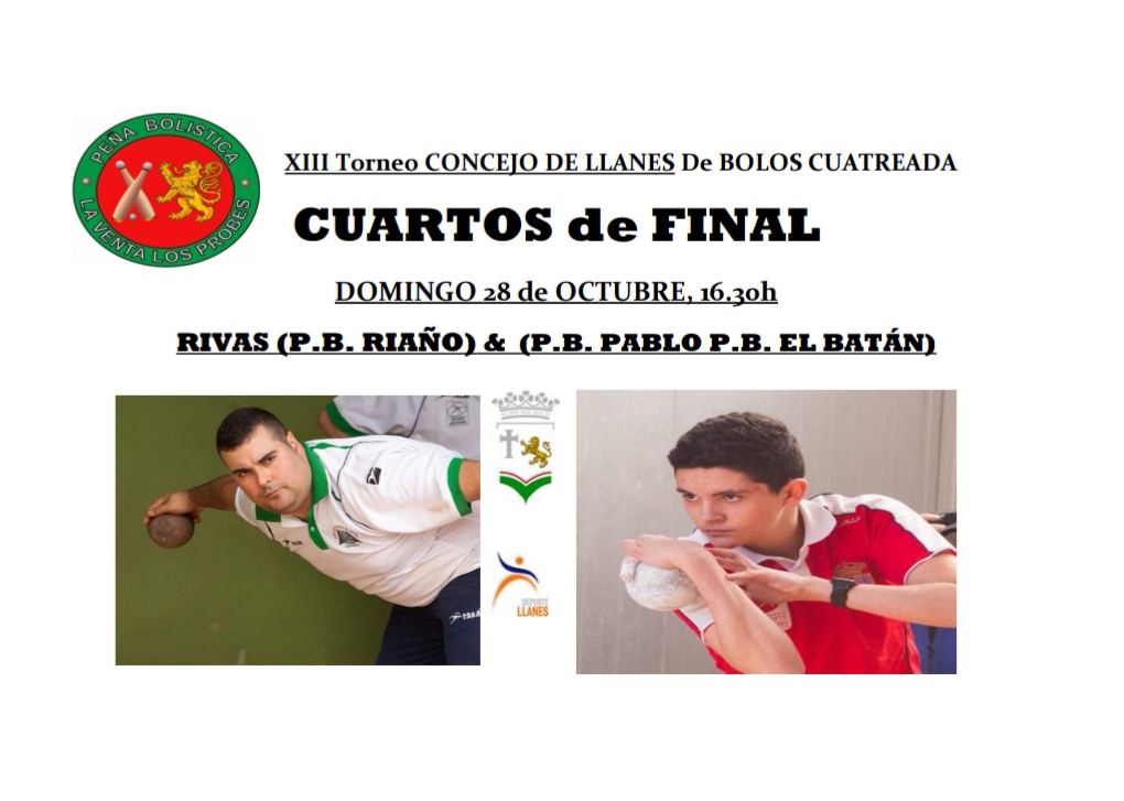 OCTAVOS: Día 6 de octubre a las 16.30 h. Jorge (P.B. Venta los Probes) & Pedro (P.B. El Horreu) y a las 18.30 h. Manuel (P.B.Lugones) & Ramiro (P.B. El Berrón), 7 de octubre a las 17.00 h. Rivas (P.B. Riaño) & Alejandro (P.B. Piles).