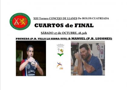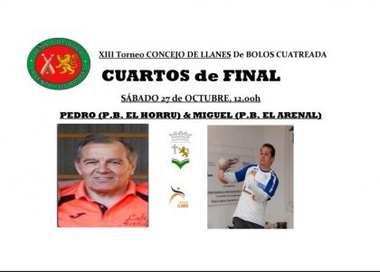 27 de octubre, a las 12.00 h. Pedro (P.B. El Horru) & Miguel (P.B. El Arenal) y a las 18.30 h. Pruneda (P.B. Villa la Sidra - Titi) & Manuel (P.B. Lugones).